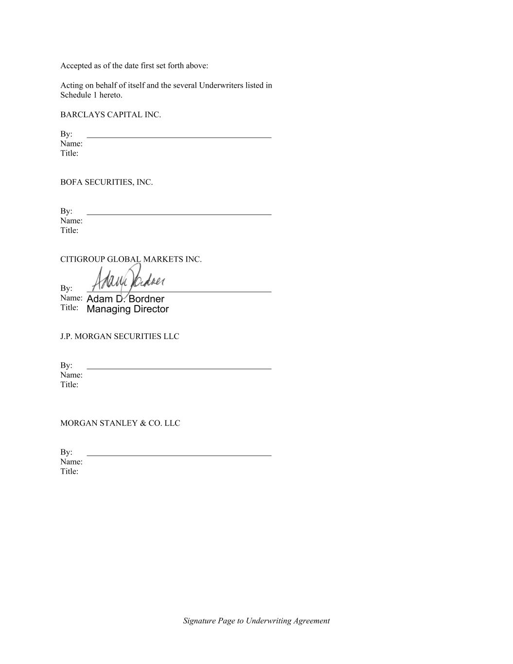 Signature Page to Underwriting Agreement Accepted as of the date first set forth above: Acting on behalf of itself and the several Underwriters listed in Schedule 1 hereto. BARCLAYS CAPITAL INC. By: Name: Title: BOFA SECURITIES, INC. By: Name: Title: CITIGROUP GLOBAL MARKETS INC. By: Name: Title: J.P. MORGAN SECURITIES LLC By: Name: Title: MORGAN STANLEY & CO. LLC By: Name: Title: Adam D. Bordner Managing Director