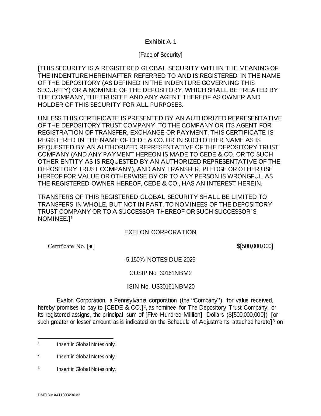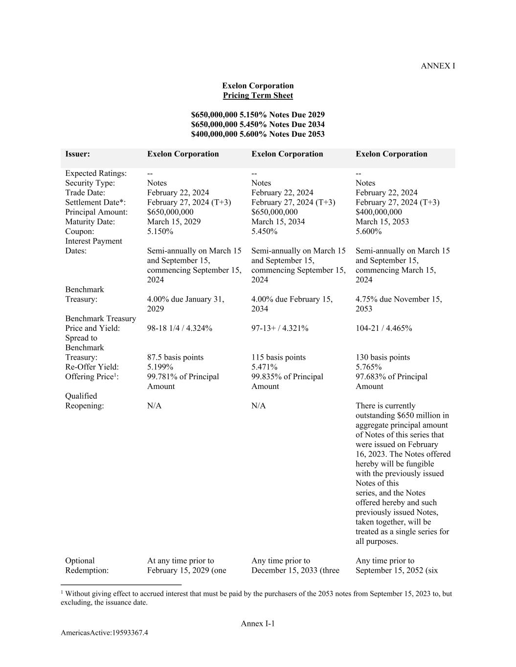 Annex I-1 AmericasActive:19593367.4 ANNEX I Exelon Corporation Pricing Term Sheet $650,000,000 5.150% Notes Due 2029 $650,000,000 5.450% Notes Due 2034 $400,000,000 5.600% Notes Due 2053 Issuer: Exelon Corporation Exelon Corporation Exelon Corporation Expected Ratings: -- -- -- Security Type: Notes Notes Notes Trade Date: February 22, 2024 February 22, 2024 February 22, 2024 Settlement Date*: February 27, 2024 (T+3) February 27, 2024 (T+3) February 27, 2024 (T+3) Principal Amount: $650,000,000 $650,000,000 $400,000,000 Maturity Date: March 15, 2029 March 15, 2034 March 15, 2053 Coupon: 5.150% 5.450% 5.600% Interest Payment Dates: Semi-annually on March 15 and September 15, commencing September 15, 2024 Semi-annually on March 15 and September 15, commencing September 15, 2024 Semi-annually on March 15 and September 15, commencing March 15, 2024 Benchmark Treasury: 4.00% due January 31, 2029 4.00% due February 15, 2034 4.75% due November 15, 2053 Benchmark Treasury Price and Yield: 98-18 1/4 / 4.324% 97-13+ / 4.321% 104-21 / 4.465% Spread to Benchmark Treasury: 87.5 basis points 115 basis points 130 basis points Re-Offer Yield: 5.199% 5.471% 5.765% Offering Price1: Qualified Reopening: 99.781% of Principal Amount N/A 99.835% of Principal Amount N/A 97.683% of Principal Amount There is currently outstanding $650 million in aggregate principal amount of Notes of this series that were issued on February 16, 2023. The Notes offered hereby will be fungible with the previously issued Notes of this series, and the Notes offered hereby and such previously issued Notes, taken together, will be treated as a single series for all purposes. Optional Redemption: At any time prior to February 15, 2029 (one Any time prior to December 15, 2033 (three Any time prior to September 15, 2052 (six 1 Without giving effect to accrued interest that must be paid by the purchasers of the 2053 notes from September 15, 2023 to, but excluding, the issuance date.