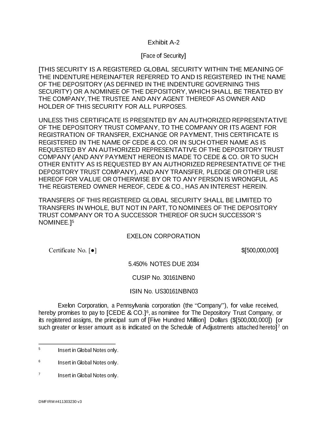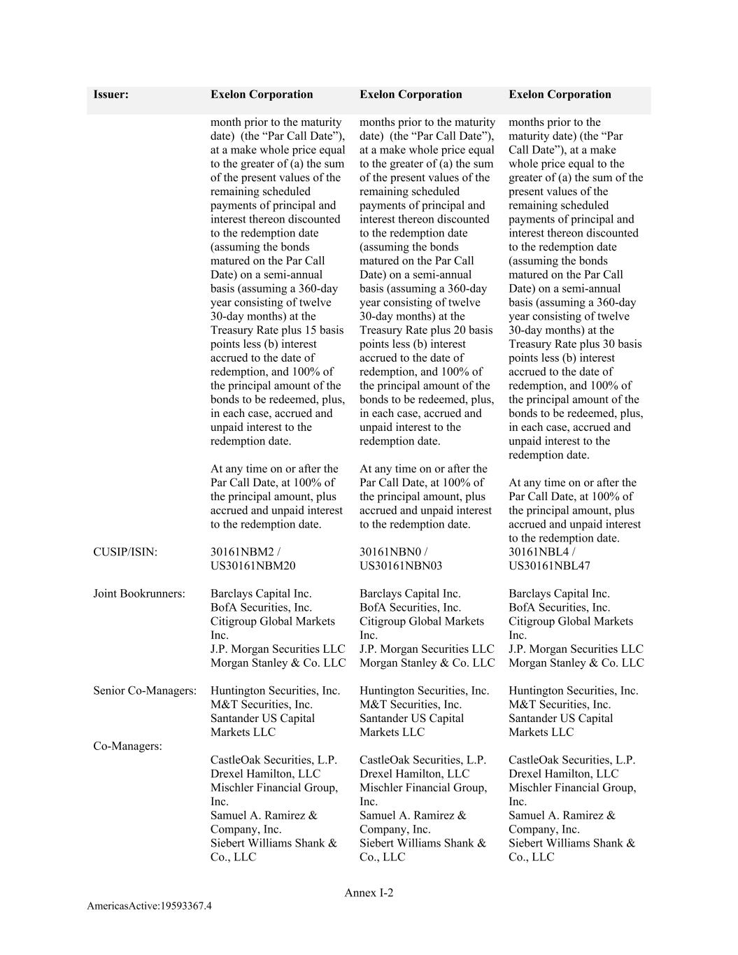 Annex I-2 AmericasActive:19593367.4 Issuer: Exelon Corporation Exelon Corporation Exelon Corporation month prior to the maturity date) (the “Par Call Date”), at a make whole price equal to the greater of (a) the sum of the present values of the remaining scheduled payments of principal and interest thereon discounted to the redemption date (assuming the bonds matured on the Par Call Date) on a semi-annual basis (assuming a 360-day year consisting of twelve 30-day months) at the Treasury Rate plus 15 basis points less (b) interest accrued to the date of redemption, and 100% of the principal amount of the bonds to be redeemed, plus, in each case, accrued and unpaid interest to the redemption date. At any time on or after the Par Call Date, at 100% of the principal amount, plus accrued and unpaid interest to the redemption date. months prior to the maturity date) (the “Par Call Date”), at a make whole price equal to the greater of (a) the sum of the present values of the remaining scheduled payments of principal and interest thereon discounted to the redemption date (assuming the bonds matured on the Par Call Date) on a semi-annual basis (assuming a 360-day year consisting of twelve 30-day months) at the Treasury Rate plus 20 basis points less (b) interest accrued to the date of redemption, and 100% of the principal amount of the bonds to be redeemed, plus, in each case, accrued and unpaid interest to the redemption date. At any time on or after the Par Call Date, at 100% of the principal amount, plus accrued and unpaid interest to the redemption date. months prior to the maturity date) (the “Par Call Date”), at a make whole price equal to the greater of (a) the sum of the present values of the remaining scheduled payments of principal and interest thereon discounted to the redemption date (assuming the bonds matured on the Par Call Date) on a semi-annual basis (assuming a 360-day year consisting of twelve 30-day months) at the Treasury Rate plus 30 basis points less (b) interest accrued to the date of redemption, and 100% of the principal amount of the bonds to be redeemed, plus, in each case, accrued and unpaid interest to the redemption date. At any time on or after the Par Call Date, at 100% of the principal amount, plus accrued and unpaid interest to the redemption date. CUSIP/ISIN: 30161NBM2 / US30161NBM20 30161NBN0 / US30161NBN03 30161NBL4 / US30161NBL47 Barclays Capital Inc. BofA Securities, Inc. Citigroup Global Markets Inc. J.P. Morgan Securities LLC Barclays Capital Inc. BofA Securities, Inc. Citigroup Global Markets Inc. J.P. Morgan Securities LLC Barclays Capital Inc. BofA Securities, Inc. Citigroup Global Markets Inc. J.P. Morgan Securities LLC Morgan Stanley & Co. LLC Morgan Stanley & Co. LLC Morgan Stanley & Co. LLC Joint Bookrunners: Senior Co-Managers: Co-Managers: Huntington Securities, Inc. M&T Securities, Inc. Santander US Capital Markets LLC CastleOak Securities, L.P. Drexel Hamilton, LLC Mischler Financial Group, Inc. Samuel A. Ramirez & Company, Inc. Siebert Williams Shank & Co., LLC Huntington Securities, Inc. M&T Securities, Inc. Santander US Capital Markets LLC CastleOak Securities, L.P. Drexel Hamilton, LLC Mischler Financial Group, Inc. Samuel A. Ramirez & Company, Inc. Siebert Williams Shank & Co., LLC Huntington Securities, Inc. M&T Securities, Inc. Santander US Capital Markets LLC CastleOak Securities, L.P. Drexel Hamilton, LLC Mischler Financial Group, Inc. Samuel A. Ramirez & Company, Inc. Siebert Williams Shank & Co., LLC