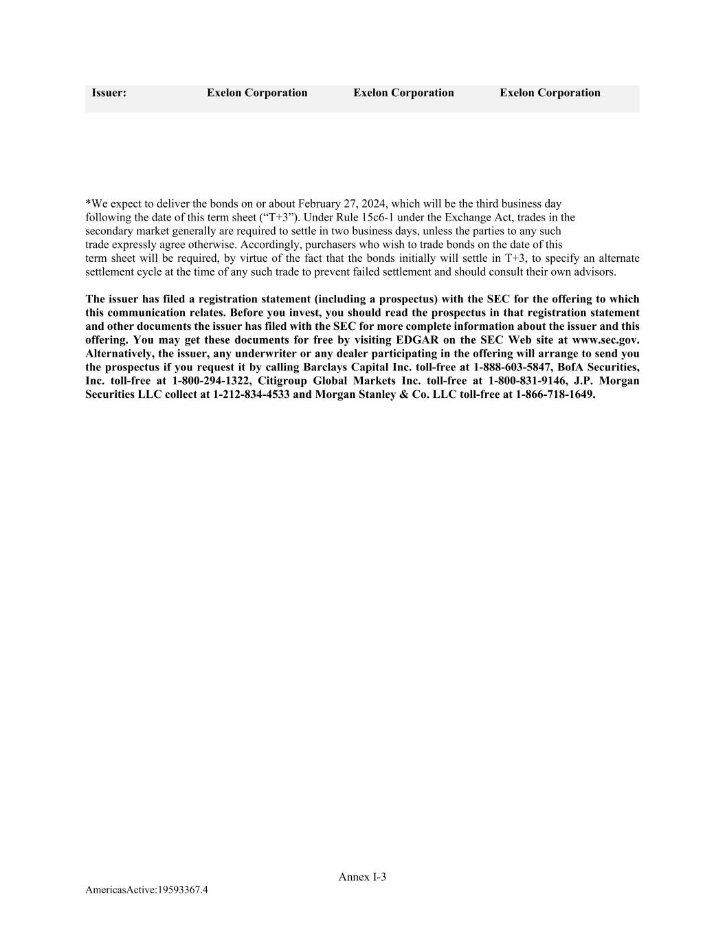 Annex I-3 AmericasActive:19593367.4 Issuer: Exelon Corporation Exelon Corporation Exelon Corporation *We expect to deliver the bonds on or about February 27, 2024, which will be the third business day following the date of this term sheet (“T+3”). Under Rule 15c6-1 under the Exchange Act, trades in the secondary market generally are required to settle in two business days, unless the parties to any such trade expressly agree otherwise. Accordingly, purchasers who wish to trade bonds on the date of this term sheet will be required, by virtue of the fact that the bonds initially will settle in T+3, to specify an alternate settlement cycle at the time of any such trade to prevent failed settlement and should consult their own advisors. The issuer has filed a registration statement (including a prospectus) with the SEC for the offering to which this communication relates. Before you invest, you should read the prospectus in that registration statement and other documents the issuer has filed with the SEC for more complete information about the issuer and this offering. You may get these documents for free by visiting EDGAR on the SEC Web site at www.sec.gov. Alternatively, the issuer, any underwriter or any dealer participating in the offering will arrange to send you the prospectus if you request it by calling Barclays Capital Inc. toll-free at 1-888-603-5847, BofA Securities, Inc. toll-free at 1-800-294-1322, Citigroup Global Markets Inc. toll-free at 1-800-831-9146, J.P. Morgan Securities LLC collect at 1-212-834-4533 and Morgan Stanley & Co. LLC toll-free at 1-866-718-1649.