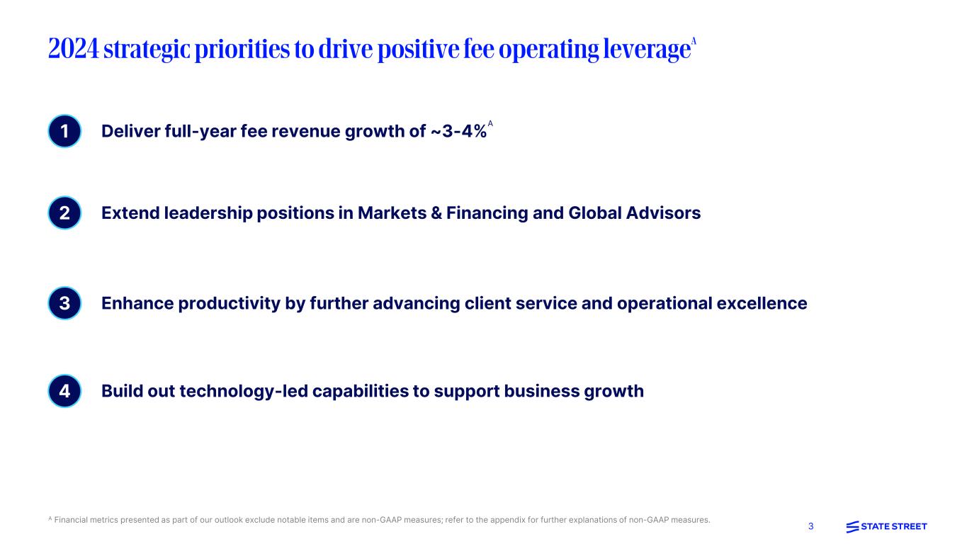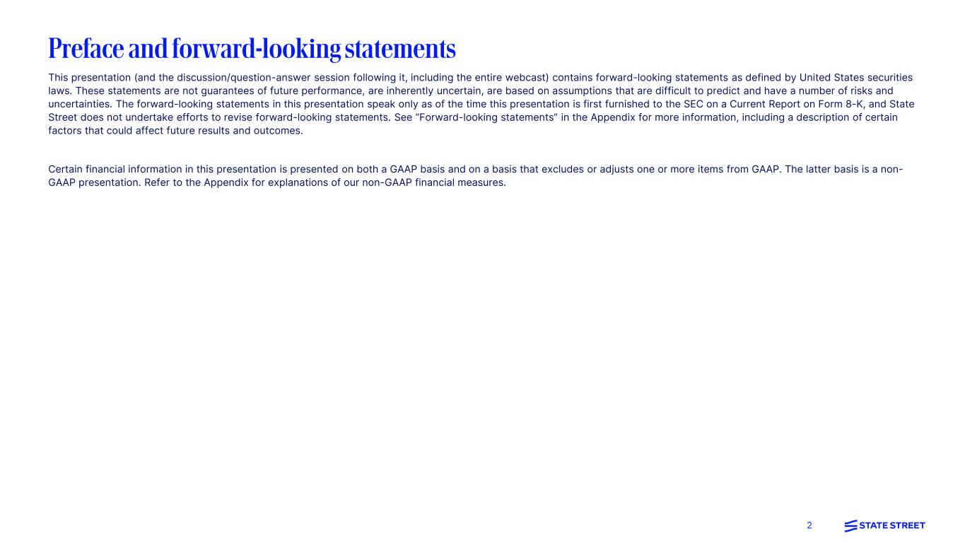 2 This presentation (and the discussion/question-answer session following it, including the entire webcast) contains forward-looking statements as defined by United States securities laws. These statements are not guarantees of future performance, are inherently uncertain, are based on assumptions that are difficult to predict and have a number of risks and uncertainties. The forward-looking statements in this presentation speak only as of the time this presentation is first furnished to the SEC on a Current Report on Form 8-K, and State Street does not undertake efforts to revise forward-looking statements. See “Forward-looking statements” in the Appendix for more information, including a description of certain factors that could affect future results and outcomes. Certain financial information in this presentation is presented on both a GAAP basis and on a basis that excludes or adjusts one or more items from GAAP. The latter basis is a non- GAAP presentation. Refer to the Appendix for explanations of our non-GAAP financial measures. Preface and forward-looking statements