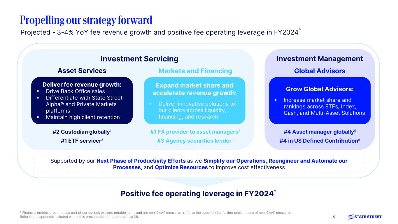 3 2024 strategic priorities to drive positive fee operating leverageA 1 2 3 4 Deliver full-year fee revenue growth of ~3-4%A Extend leadership positions in Markets & Financing and Global Advisors Enhance productivity by further advancing client service and operational excellence Build out technology-led capabilities to support business growth A Financial metrics presented as part of our outlook exclude notable items and are non-GAAP measures; refer to the appendix for further explanations of non-GAAP measures.