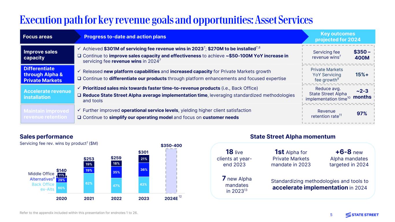 4 A Financial metrics presented as part of our outlook exclude notable items and are non-GAAP measures; refer to the appendix for further explanations of non-GAAP measures. Refer to the appendix included within this presentation for endnotes 1 to 26. Propelling our strategy forward Projected ~3-4% YoY fee revenue growth and positive fee operating leverage in FY2024A Positive fee operating leverage in FY2024A Deliver fee revenue growth: Drive Back Office sales Differentiate with State Street Alpha® and Private Markets platforms Maintain high client retention Expand market share and accelerate revenue growth: Deliver innovative solutions to our clients across liquidity, financing, and research Asset Services Markets and Financing Investment Servicing Grow Global Advisors: Increase market share and rankings across ETFs, Index, Cash, and Multi-Asset Solutions Global Advisors Investment Management Supported by our Next Phase of Productivity Efforts as we Simplify our Operations, Reengineer and Automate our Processes, and Optimize Resources to improve cost effectiveness #2 Custodian globally1 #1 ETF servicer2 #1 FX provider to asset managers3 #3 Agency securities lender4 #4 Asset manager globally5 #4 in US Defined Contribution6