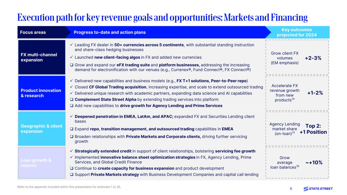5 Execution path for key revenue goals and opportunities: Asset Services Refer to the appendix included within this presentation for endnotes 1 to 26. Key outcomes projected for 2024Progress to-date and action plansFocus areas Improve sales capacity Differentiate through Alpha & Private Markets Accelerate revenue installation Maintain improved revenue retention Achieved $301M of servicing fee revenue wins in 20237; $270M to be installed7,8 Continue to improve sales capacity and effectiveness to achieve ~$50-100M YoY increase in servicing fee revenue wins in 20247 Released new platform capabilities and increased capacity for Private Markets growth Continue to differentiate our products through platform enhancements and focused expertise Prioritized sales mix towards faster time-to-revenue products (i.e., Back Office) Reduce State Street Alpha average implementation time, leveraging standardized methodologies and tools Further improved operational service levels, yielding higher client satisfaction Continue to simplify our operating model and focus on customer needs Servicing fee revenue wins7 Revenue retention rate11 Private Markets YoY Servicing fee growth9 Reduce avg. State Street Alpha implementation time10 $350 – 400M 97% 15%+ ~2-3 months Servicing fee rev. wins by product7 ($M) 60% 62% 47% 29% 19% 35% 19% 18% 2020 2021 2022 2023 2024E 11% $140 $253 $259 $301 $350-400 Middle Office Alternatives9 Back Office ex-Alts 18 live clients at year- end 2023 7 new Alpha mandates in 202313 1st Alpha for Private Markets mandate in 2023 +6-8 new Alpha mandates targeted in 2024 Standardizing methodologies and tools to accelerate implementation in 2024 State Street Alpha momentumSales performance 43% 36% 21% 12
