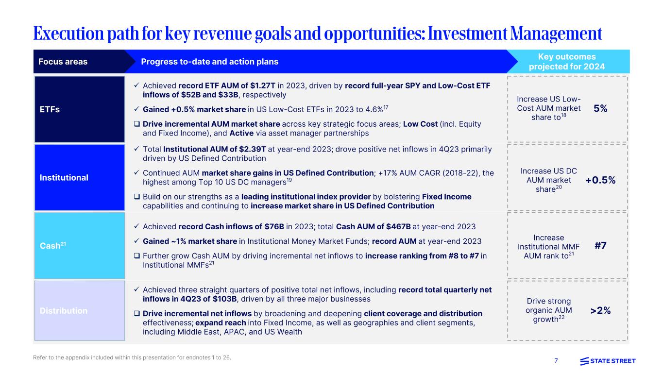 6 Execution path for key revenue goals and opportunities: Markets and Financing Refer to the appendix included within this presentation for endnotes 1 to 26. Key outcomes projected for 2024Progress to-date and action plansFocus areas FX multi-channel expansion Leading FX dealer in 50+ currencies across 5 continents, with substantial standing instruction and share-class hedging businesses Launched new client-facing algos in FX and added new currencies Grow and expand our eFX trading suite and platform businesses, addressing the increasing demand for electronification with our venues (e.g., Currenex®, Fund Connect®, FX Connect®) Grow client FX volumes (EM emphasis) +2-3% Product innovation & research Delivered new capabilities and business models (e.g., FX T+1 solutions, Peer-to-Peer repo) Closed CF Global Trading acquisition, increasing expertise, and scale to extend outsourced trading Delivered unique research with academic partners, expanding data science and AI capabilities Complement State Street Alpha by extending trading services into platform Add new capabilities to drive growth for Agency Lending and Prime Services Accelerate FX revenue growth from new products14 +1-2% Geographic & client expansion Deepened penetration in EMEA, LatAm, and APAC; expanded FX and Securities Lending client bases Expand repo, transition management, and outsourced trading capabilities in EMEA Broaden relationships with Private Markets and Corporate clients, driving further servicing growth Agency Lending market share (on-loan)15 Top 2: +1 Position Loan growth & returns Strategically extended credit in support of client relationships, bolstering servicing fee growth Implemented innovative balance sheet optimization strategies in FX, Agency Lending, Prime Services, and Global Credit Finance Continue to create capacity for business expansion and product development Support Private Markets strategy with Business Development Companies and capital call lending Grow average loan balances16 ~+10%