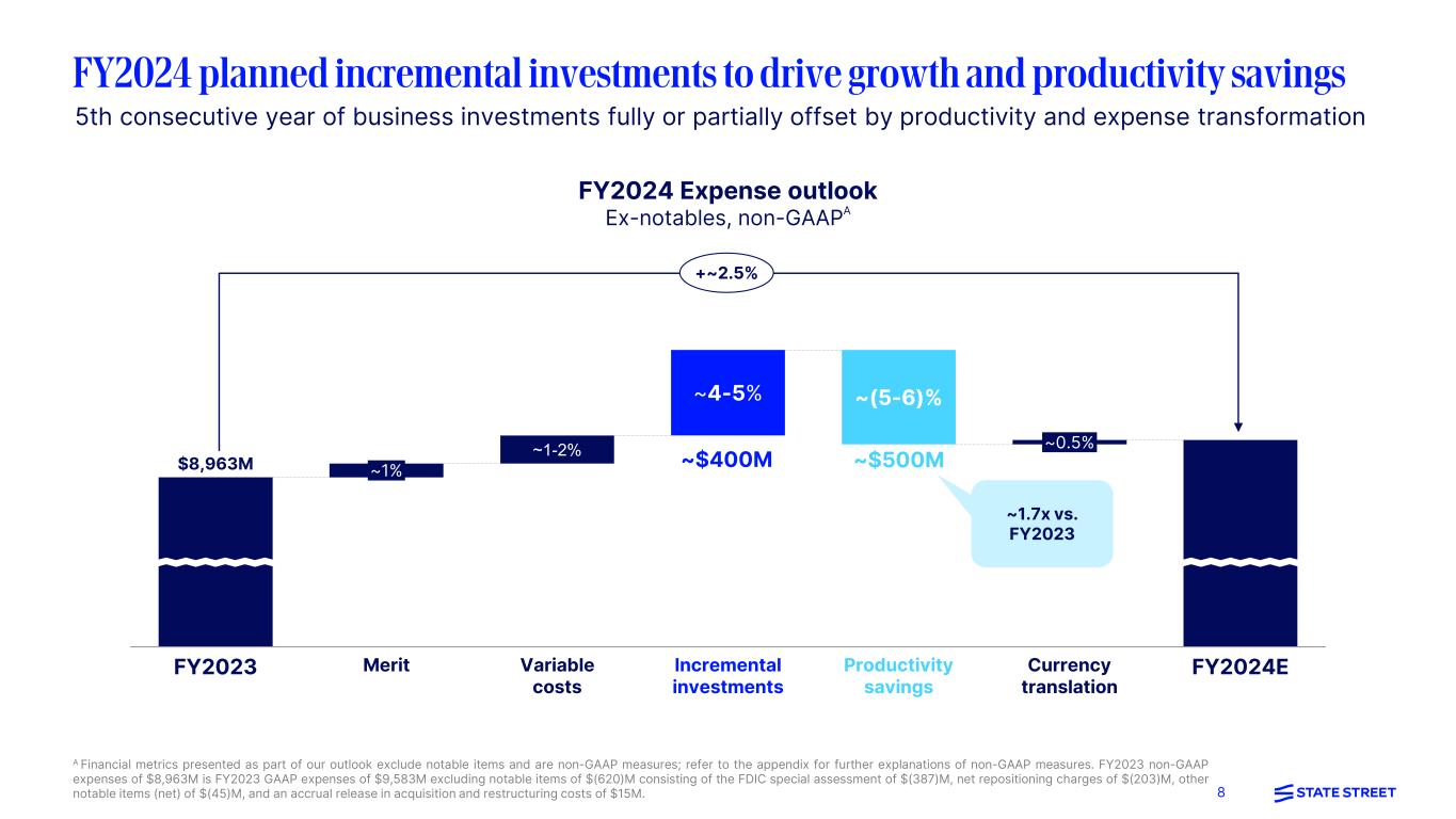 7Refer to the appendix included within this presentation for endnotes 1 to 26. Key outcomes projected for 2024Progress to-date and action plansFocus areas ETFs Achieved record ETF AUM of $1.27T in 2023, driven by record full-year SPY and Low-Cost ETF inflows of $52B and $33B, respectively Gained +0.5% market share in US Low-Cost ETFs in 2023 to 4.6%17 Drive incremental AUM market share across key strategic focus areas; Low Cost (incl. Equity and Fixed Income), and Active via asset manager partnerships Institutional Total Institutional AUM of $2.39T at year-end 2023; drove positive net inflows in 4Q23 primarily driven by US Defined Contribution Continued AUM market share gains in US Defined Contribution; +17% AUM CAGR (2018-22), the highest among Top 10 US DC managers19 Build on our strengths as a leading institutional index provider by bolstering Fixed Income capabilities and continuing to increase market share in US Defined Contribution Cash21 Achieved record Cash inflows of $76B in 2023; total Cash AUM of $467B at year-end 2023 Gained ~1% market share in Institutional Money Market Funds; record AUM at year-end 2023 Further grow Cash AUM by driving incremental net inflows to increase ranking from #8 to #7 in Institutional MMFs21 Distribution Achieved three straight quarters of positive total net inflows, including record total quarterly net inflows in 4Q23 of $103B, driven by all three major businesses Drive incremental net inflows by broadening and deepening client coverage and distribution effectiveness; expand reach into Fixed Income, as well as geographies and client segments, including Middle East, APAC, and US Wealth Increase US Low- Cost AUM market share to18 5% Increase US DC AUM market share20 +0.5% Increase Institutional MMF AUM rank to21 #7 Drive strong organic AUM growth22 >2% Execution path for key revenue goals and opportunities: Investment Management