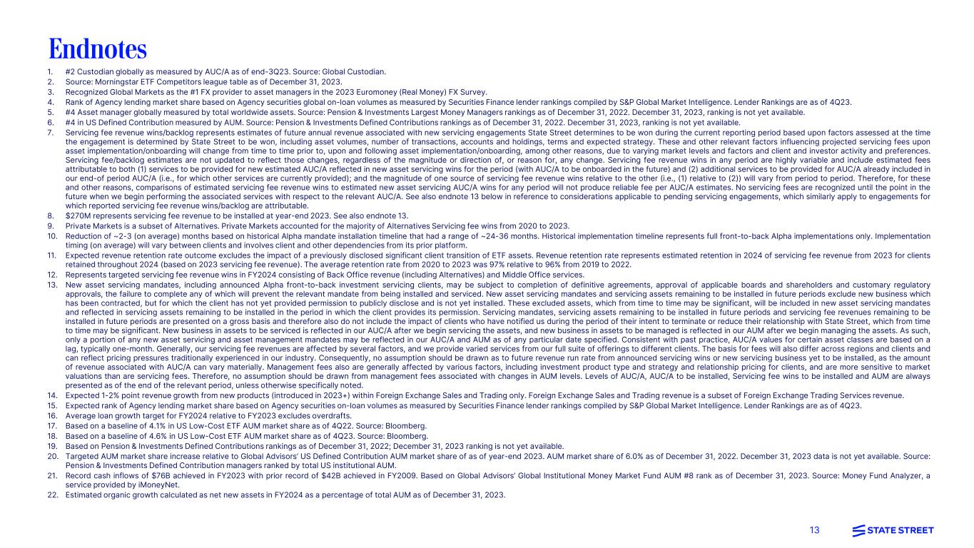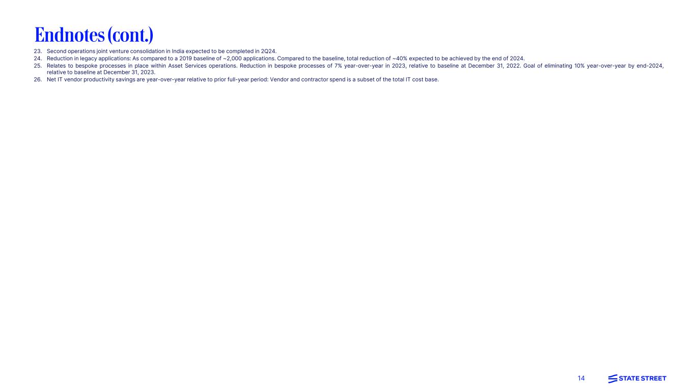 13 Endnotes 1. #2 Custodian globally as measured by AUC/A as of end-3Q23. Source: Global Custodian. 2. Source: Morningstar ETF Competitors league table as of December 31, 2023. 3. Recognized Global Markets as the #1 FX provider to asset managers in the 2023 Euromoney (Real Money) FX Survey. 4. Rank of Agency lending market share based on Agency securities global on-loan volumes as measured by Securities Finance lender rankings compiled by S&P Global Market Intelligence. Lender Rankings are as of 4Q23. 5. #4 Asset manager globally measured by total worldwide assets. Source: Pension & Investments Largest Money Managers rankings as of December 31, 2022. December 31, 2023, ranking is not yet available. 6. #4 in US Defined Contribution measured by AUM. Source: Pension & Investments Defined Contributions rankings as of December 31, 2022. December 31, 2023, ranking is not yet available. 7. Servicing fee revenue wins/backlog represents estimates of future annual revenue associated with new servicing engagements State Street determines to be won during the current reporting period based upon factors assessed at the time the engagement is determined by State Street to be won, including asset volumes, number of transactions, accounts and holdings, terms and expected strategy. These and other relevant factors influencing projected servicing fees upon asset implementation/onboarding will change from time to time prior to, upon and following asset implementation/onboarding, among other reasons, due to varying market levels and factors and client and investor activity and preferences. Servicing fee/backlog estimates are not updated to reflect those changes, regardless of the magnitude or direction of, or reason for, any change. Servicing fee revenue wins in any period are highly variable and include estimated fees attributable to both (1) services to be provided for new estimated AUC/A reflected in new asset servicing wins for the period (with AUC/A to be onboarded in the future) and (2) additional services to be provided for AUC/A already included in our end-of period AUC/A (i.e., for which other services are currently provided); and the magnitude of one source of servicing fee revenue wins relative to the other (i.e., (1) relative to (2)) will vary from period to period. Therefore, for these and other reasons, comparisons of estimated servicing fee revenue wins to estimated new asset servicing AUC/A wins for any period will not produce reliable fee per AUC/A estimates. No servicing fees are recognized until the point in the future when we begin performing the associated services with respect to the relevant AUC/A. See also endnote 13 below in reference to considerations applicable to pending servicing engagements, which similarly apply to engagements for which reported servicing fee revenue wins/backlog are attributable. 8. $270M represents servicing fee revenue to be installed at year-end 2023. See also endnote 13. 9. Private Markets is a subset of Alternatives. Private Markets accounted for the majority of Alternatives Servicing fee wins from 2020 to 2023. 10. Reduction of ~2-3 (on average) months based on historical Alpha mandate installation timeline that had a range of ~24-36 months. Historical implementation timeline represents full front-to-back Alpha implementations only. Implementation timing (on average) will vary between clients and involves client and other dependencies from its prior platform. 11. Expected revenue retention rate outcome excludes the impact of a previously disclosed significant client transition of ETF assets. Revenue retention rate represents estimated retention in 2024 of servicing fee revenue from 2023 for clients retained throughout 2024 (based on 2023 servicing fee revenue). The average retention rate from 2020 to 2023 was 97% relative to 96% from 2019 to 2022. 12. Represents targeted servicing fee revenue wins in FY2024 consisting of Back Office revenue (including Alternatives) and Middle Office services. 13. New asset servicing mandates, including announced Alpha front-to-back investment servicing clients, may be subject to completion of definitive agreements, approval of applicable boards and shareholders and customary regulatory approvals, the failure to complete any of which will prevent the relevant mandate from being installed and serviced. New asset servicing mandates and servicing assets remaining to be installed in future periods exclude new business which has been contracted, but for which the client has not yet provided permission to publicly disclose and is not yet installed. These excluded assets, which from time to time may be significant, will be included in new asset servicing mandates and reflected in servicing assets remaining to be installed in the period in which the client provides its permission. Servicing mandates, servicing assets remaining to be installed in future periods and servicing fee revenues remaining to be installed in future periods are presented on a gross basis and therefore also do not include the impact of clients who have notified us during the period of their intent to terminate or reduce their relationship with State Street, which from time to time may be significant. New business in assets to be serviced is reflected in our AUC/A after we begin servicing the assets, and new business in assets to be managed is reflected in our AUM after we begin managing the assets. As such, only a portion of any new asset servicing and asset management mandates may be reflected in our AUC/A and AUM as of any particular date specified. Consistent with past practice, AUC/A values for certain asset classes are based on a lag, typically one-month. Generally, our servicing fee revenues are affected by several factors, and we provide varied services from our full suite of offerings to different clients. The basis for fees will also differ across regions and clients and can reflect pricing pressures traditionally experienced in our industry. Conse