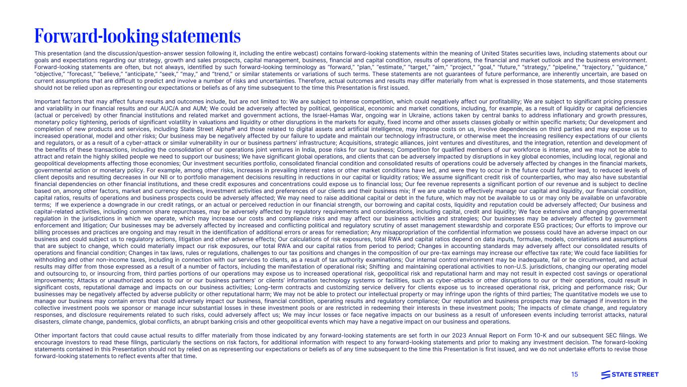 14 Endnotes (cont.) 23. Second operations joint venture consolidation in India expected to be completed in 2Q24. 24. Reduction in legacy applications: As compared to a 2019 baseline of ~2,000 applications. Compared to the baseline, total reduction of ~40% expected to be achieved by the end of 2024. 25. Relates to bespoke processes in place within Asset Services operations. Reduction in bespoke processes of 7% year-over-year in 2023, relative to baseline at December 31, 2022. Goal of eliminating 10% year-over-year by end-2024, relative to baseline at December 31, 2023. 26. Net IT vendor productivity savings are year-over-year relative to prior full-year period: Vendor and contractor spend is a subset of the total IT cost base.