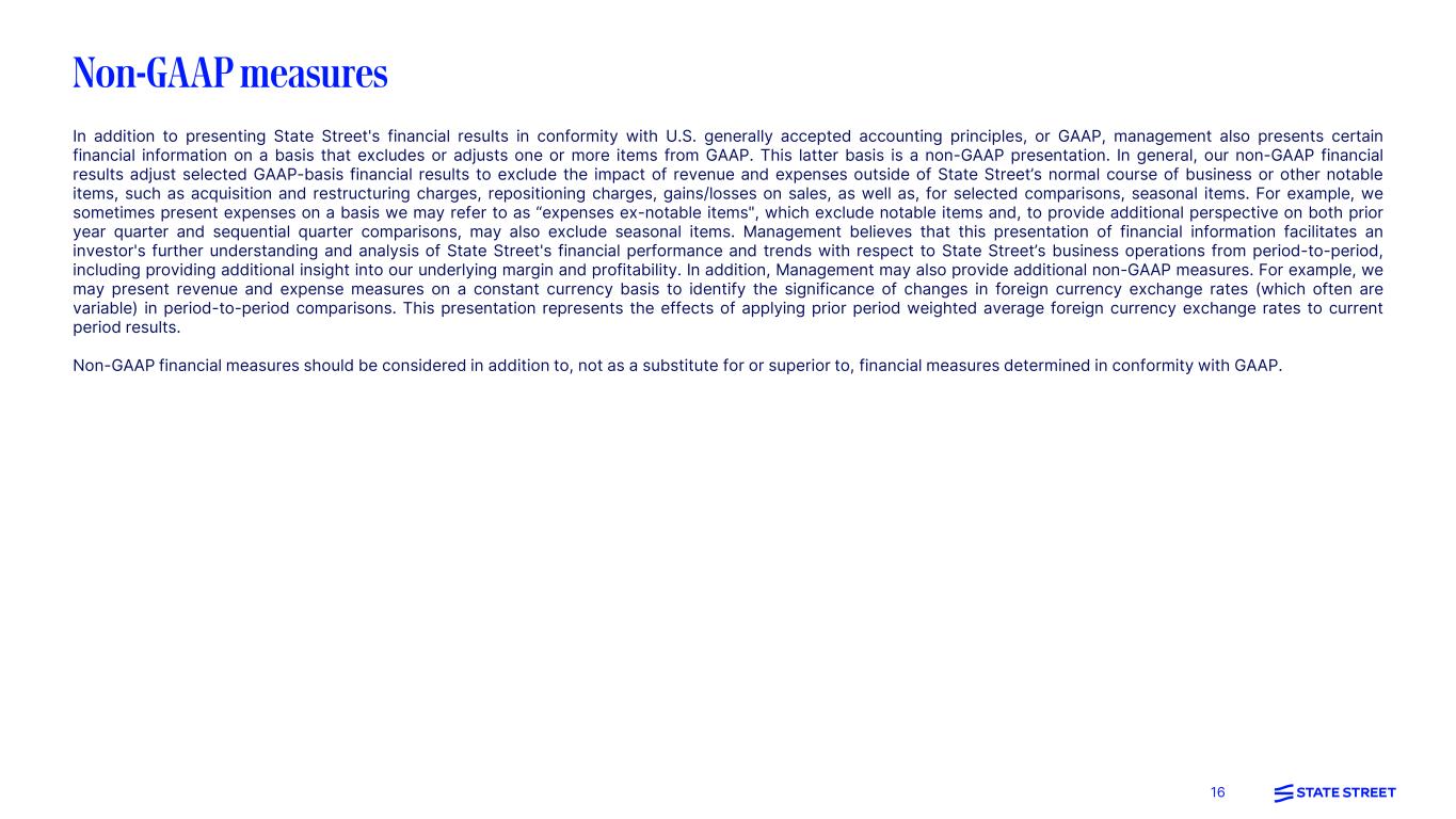 15 Forward-looking statements This presentation (and the discussion/question-answer session following it, including the entire webcast) contains forward-looking statements within the meaning of United States securities laws, including statements about our goals and expectations regarding our strategy, growth and sales prospects, capital management, business, financial and capital condition, results of operations, the financial and market outlook and the business environment. Forward-looking statements are often, but not always, identified by such forward-looking terminology as “forward,” “plan,” “estimate,” “target,” “aim,” “project," “goal," "future," “strategy,” "pipeline," “trajectory,” “guidance,” “objective,” “forecast,” “believe,” “anticipate,” “seek,” “may,” and “trend,” or similar statements or variations of such terms. These statements are not guarantees of future performance, are inherently uncertain, are based on current assumptions that are difficult to predict and involve a number of risks and uncertainties. Therefore, actual outcomes and results may differ materially from what is expressed in those statements, and those statements should not be relied upon as representing our expectations or beliefs as of any time subsequent to the time this Presentation is first issued. Important factors that may affect future results and outcomes include, but are not limited to: We are subject to intense competition, which could negatively affect our profitability; We are subject to significant pricing pressure and variability in our financial results and our AUC/A and AUM; We could be adversely affected by political, geopolitical, economic and market conditions, including, for example, as a result of liquidity or capital deficiencies (actual or perceived) by other financial institutions and related market and government actions, the Israel-Hamas War, ongoing war in Ukraine, actions taken by central banks to address inflationary and growth pressures, monetary policy tightening, periods of significant volatility in valuations and liquidity or other disruptions in the markets for equity, fixed income and other assets classes globally or within specific markets; Our development and completion of new products and services, including State Street Alpha® and those related to digital assets and artificial intelligence, may impose costs on us, involve dependencies on third parties and may expose us to increased operational, model and other risks; Our business may be negatively affected by our failure to update and maintain our technology infrastructure, or otherwise meet the increasing resiliency expectations of our clients and regulators, or as a result of a cyber-attack or similar vulnerability in our or business partners' infrastructure; Acquisitions, strategic alliances, joint ventures and divestitures, and the integration, retention and development of the benefits of these transactions, including the consolidation of our operations joint ventures in India, pose risks for our business; Competition for qualified members of our workforce is intense, and we may not be able to attract and retain the highly skilled people we need to support our business; We have significant global operations, and clients that can be adversely impacted by disruptions in key global economies, including local, regional and geopolitical developments affecting those economies; Our investment securities portfolio, consolidated financial condition and consolidated results of operations could be adversely affected by changes in the financial markets, governmental action or monetary policy. For example, among other risks, increases in prevailing interest rates or other market conditions have led, and were they to occur in the future could further lead, to reduced levels of client deposits and resulting decreases in our NII or to portfolio management decisions resulting in reductions in our capital or liquidity ratios; We assume significant credit risk of counterparties, who may also have substantial financial dependencies on other financial institutions, and these credit exposures and concentrations could expose us to financial loss; Our fee revenue represents a significant portion of our revenue and is subject to decline based on, among other factors, market and currency declines, investment activities and preferences of our clients and their business mix; If we are unable to effectively manage our capital and liquidity, our financial condition, capital ratios, results of operations and business prospects could be adversely affected; We may need to raise additional capital or debt in the future, which may not be available to us or may only be available on unfavorable terms; If we experience a downgrade in our credit ratings, or an actual or perceived reduction in our financial strength, our borrowing and capital costs, liquidity and reputation could be adversely affected; Our business and capital-related activities, including common share repurchases, may be adversely affected by regulatory requirements and considerations, including capital, credit and liquidity; We face extensive and changing governmental regulation in the jurisdictions in which we operate, which may increase our costs and compliance risks and may affect our business activities and strategies; Our businesses may be adversely affected by government enforcement and litigation; Our businesses may be adversely affected by increased and conflicting political and regulatory scrutiny of asset management stewardship and corporate ESG practices; Our efforts to improve our billing processes and practices are ongoing and may result in the identification of additional errors or areas for remediation; Any misappropriation of the confidential information we possess could have an adverse impact on our business and could subject us to regulatory actions, litigation and other adverse effects; Our calculatio