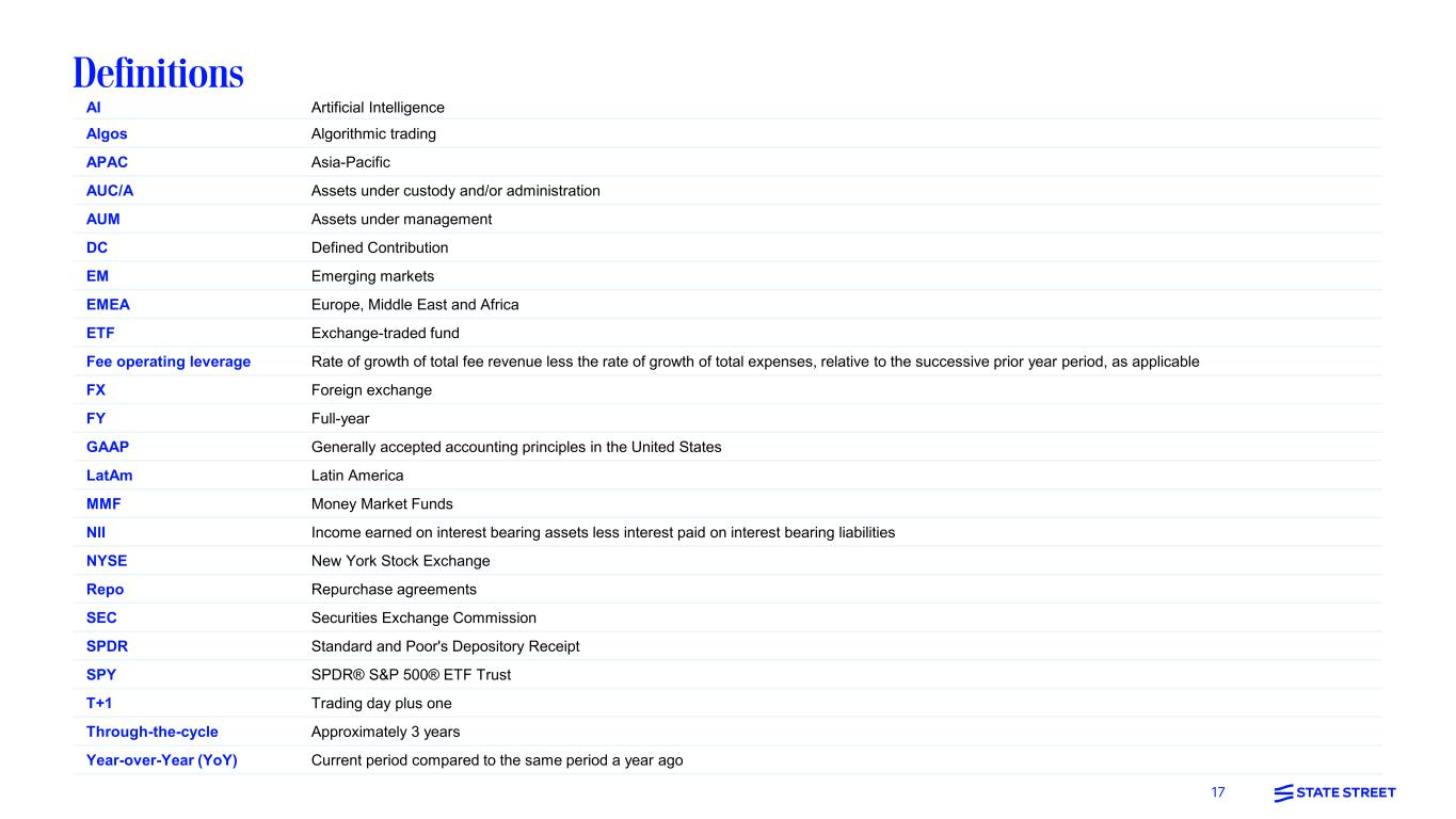 16 Non-GAAP measures In addition to presenting State Street's financial results in conformity with U.S. generally accepted accounting principles, or GAAP, management also presents certain financial information on a basis that excludes or adjusts one or more items from GAAP. This latter basis is a non-GAAP presentation. In general, our non-GAAP financial results adjust selected GAAP-basis financial results to exclude the impact of revenue and expenses outside of State Street’s normal course of business or other notable items, such as acquisition and restructuring charges, repositioning charges, gains/losses on sales, as well as, for selected comparisons, seasonal items. For example, we sometimes present expenses on a basis we may refer to as “expenses ex-notable items", which exclude notable items and, to provide additional perspective on both prior year quarter and sequential quarter comparisons, may also exclude seasonal items. Management believes that this presentation of financial information facilitates an investor's further understanding and analysis of State Street's financial performance and trends with respect to State Street’s business operations from period-to-period, including providing additional insight into our underlying margin and profitability. In addition, Management may also provide additional non-GAAP measures. For example, we may present revenue and expense measures on a constant currency basis to identify the significance of changes in foreign currency exchange rates (which often are variable) in period-to-period comparisons. This presentation represents the effects of applying prior period weighted average foreign currency exchange rates to current period results. Non-GAAP financial measures should be considered in addition to, not as a substitute for or superior to, financial measures determined in conformity with GAAP.