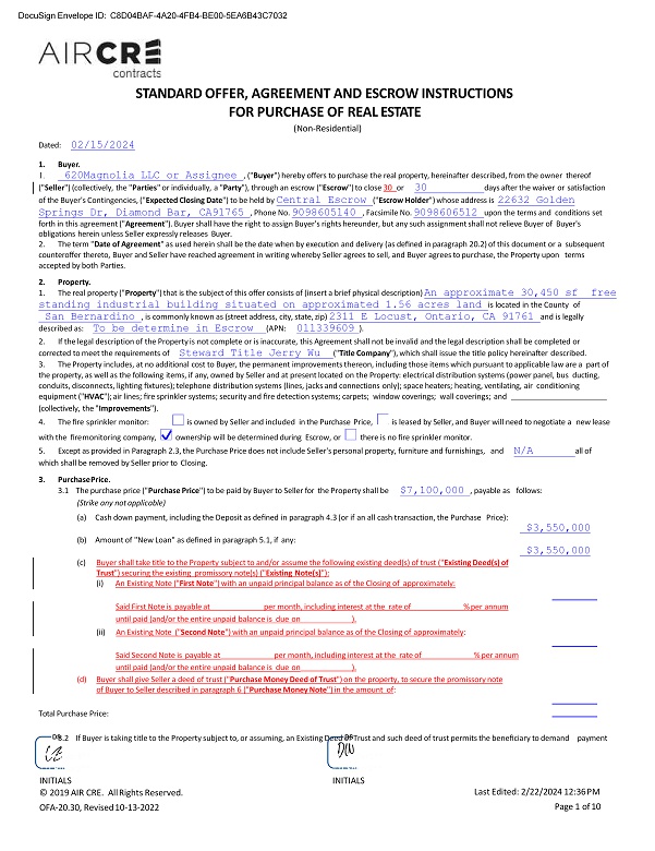 1 . B u y e r . 1. 620Magnolia LLC or Assignee , (" Buyer ") hereby offers to purchase the real property, hereinafter described, from the owner thereof (" Seller ") (collectively, the " Parties " or individually, a " Party "), through an escrow (" Escrow ") to close 30 or 30 days after the waiver or satisfaction of the Buyer's Contingencies, (" Expected Closing Date ") to be held by Central Escrow (" Escrow Holder ") whose address is 22632 Golden Springs Dr, Diamond Bar, CA91765 , Phone No. 9098605140 , Facsimile No. 9098606512 upon the terms and conditions set forth in this agreement (" Agreement "). Buyer shall have the right to assign Buyer's rights hereunder, but any such assignment shall not relieve Buyer of Buyer's obligations herein unless Seller expressly releases Buyer. 2. The term " Date of Agreement " as used herein shall be the date when by execution and delivery (as defined in paragraph 20.2) of this document or a subsequent counteroffer thereto, Buyer and Seller have reached agreement in writing whereby Seller agrees to sell, and Buyer agrees to purchase, the Property upon terms accepted by both Parties. 2 . P r oper t y . $3,550,000 $3,550,000 STANDARD OFFER, AGREEMENT AND ESCROW INSTRUCTIONS FOR PURCHASE OF REAL ESTATE (Non - Residential) Dated: 02/15/2024 1. The real property (" Property ") that is the subject of this offer consists of (insert a brief physical description) An approximate 30,450 sf free standing industrial building situated on approximated 1.56 acres land is located in the County of San Bernardino , is commonly known as (street address, city, state, zip) 2311 E Locust, Ontario, CA 91761 and is legally described as: To be determine in Escrow (APN: 011339609 ). 2. If the legal description of the Property is not complete or is inaccurate, this Agreement shall not be invalid and the legal description shall be completed or corrected to meet the requirements of Steward Title Jerry Wu (" Title Company "), which shall issue the title policy hereinafter described. 3. The Property includes, at no additional cost to Buyer, the permanent improvements thereon, including those items which pursuant to applicable law are a part of the property, as well as the following items, if any, owned by Seller and at present located on the Property: electrical distribution systems (power panel, bus ducting, conduits, disconnects, lighting fixtures); telephone distribution systems (lines, jacks and connections only); space heaters; heating, ventilating, air conditioning equipment (" HVAC "); air lines; fire sprinkler systems; security and fire detection systems; carpets; window coverings; wall coverings; and (collectively, the " Improvements "). 4. The fire sprinkler monitor: is owned by Seller and included in the Purchase Price, is leased by Seller, and Buyer will need to negotiate a new lease with the fire monitoring company, ownership will be determined during Escrow, or there is no fire sprinkler monitor. 5. Except as provided in Paragraph 2.3, the Purchase Price does not include Seller's personal property, furniture and furnishings, and N/A all of which shall be removed by Seller prior to Closing. 3. Purchase Price. 3.1 The purchase price (" Purchase Price ") to be paid by Buyer to Seller for the Property shall be $7,100,000 , payable as follows: (Strike any not applicable) (a) Cash down payment, including the Deposit as defined in paragraph 4.3 (or if an all cash transaction, the Purchase Price): (b) Amount of "New Loan" as defined in paragraph 5.1, if any: (c) Buyer shall take title to the Property subject to and/or assume the following existing deed(s) of trust (" Existing Deed(s) of Trust ") securing the existing promissory note(s) (" Existing Note(s) "): (i) An Existing Note (" First Note ") with an unpaid principal balance as of the Closing of approximately: Said First Note is payable at per month, including interest at the rate of % per annum until paid (and/or the entire unpaid balance is due on ). (ii) An Existing Note (" Second Note ") with an unpaid principal balance as of the Closing of approximately : Said Second Note is payable at per month, including interest at the rate of % per annum until paid (and/or the entire unpaid balance is due on ). (d) Buyer shall give Seller a deed of trust (" Purchase Money Deed of Trust ") on the property, to secure the promissory note of Buyer to Seller described in paragraph 6 (" Purchase Money Note ") in the amount of : Total Purchase Price: 3.2 If Buyer is taking title to the Property subject to, or assuming, an Existing Deed of Trust and such deed of trust permits the beneficiary to demand payment DocuSign Envelope ID: C8D04BAF - 4A20 - 4FB4 - BE00 - 5EA6B43C7032 **I - Buyer1** * * I - B u y e r2 ** INITIALS © 2019 AIR CRE. All Rights Reserved. OFA - 20.30, Revised 10 - 13 - 2022 **I - Seller1** * * I - S e l l e r2 ** INITIALS Last Edited: 2/22/2024 12:36 PM Page 1 of 10