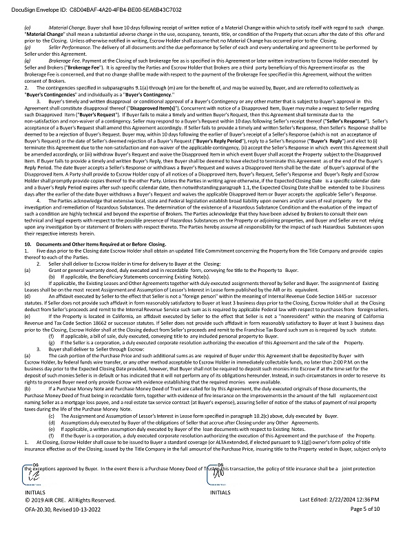 DocuSign Envelope ID: C8D04BAF - 4A20 - 4FB4 - BE00 - 5EA6B43C7032 (o) Material Change . Buyer shall have 10 days following receipt of written notice of a Material Change within which to satisfy itself with regard to such change. " Material Change " shall mean a substantial adverse change in the use, occupancy, tenants, title, or condition of the Property that occurs after the date of this offer and prior to the Closing. Unless otherwise notified in writing, Escrow Holder shall assume that no Material Change has occurred prior to the Closing. (p) Seller Performance . The delivery of all documents and the due performance by Seller of each and every undertaking and agreement to be performed by Seller under this Agreement. (q) Brokerage Fee . Payment at the Closing of such brokerage fee as is specified in this Agreement or later written instructions to Escrow Holder executed by Seller and Brokers (" Brokerage Fee "). It is agreed by the Parties and Escrow Holder that Brokers are a third party beneficiary of this Agreement insofar as the Brokerage Fee is concerned, and that no change shall be made with respect to the payment of the Brokerage Fee specified in this Agreement, without the written consent of Brokers. 2. The contingencies specified in subparagraphs 9.1(a) through (m) are for the benefit of, and may be waived by, Buyer, and are referred to collectively as " Buyer's Contingencies " and individually as a " Buyer's Contingency ." 3. Buyer's timely and written disapproval or conditional approval of a Buyer's Contingency or any other matter that is subject to Buyer's approval in this Agreement shall constitute disapproval thereof (" Disapproved Item(s) "). Concurrent with notice of a Disapproved Item, Buyer may make a request to Seller regarding such Disapproved Item (" Buyer's Request "). If Buyer fails to make a timely and written Buyer's Request, then this Agreement shall terminate due to the non - satisfaction and non - waiver of a contingency. Seller may respond to a Buyer's Request within 10 days following Seller's receipt thereof (" Seller's Response "). Seller's acceptance of a Buyer's Request shall amend this Agreement accordingly. If Seller fails to provide a timely and written Seller's Response, then Seller's Response shall be deemed to be a rejection of Buyer's Request. Buyer may, within 10 days following the earlier of Buyer's receipt of a Seller's Response (which is not an acceptance of Buyer's Request) or the date of Seller's deemed rejection of a Buyer's Request (" Buyer's Reply Period "), reply to a Seller's Response (" Buyer's Reply ") and elect to (i) terminate this Agreement due to the non - satisfaction and non - waiver of the applicable contingency, (ii) accept the Seller's Response in which event this Agreement shall be amended accordingly, or (iii) withdraw Buyer's Request and waive the Disapproved Item in which event Buyer shall accept the Property subject to the Disapproved Item. If Buyer fails to provide a timely and written Buyer's Reply, then Buyer shall be deemed to have elected to terminate this Agreement as of the end of the Buyer's Reply Period. The date Buyer accepts a Seller's Response or withdraws a Buyer's Request and waives a Disapproved Item shall be the date of Buyer's approval of the Disapproved Item. A Party shall provide to Escrow Holder copy of all notices of a Disapproved Item, Buyer's Request, Seller's Response and Buyer's Reply and Escrow Holder shall promptly provide copies thereof to the other Party. Unless the Parties in writing agree otherwise, if the Expected Closing Date is a specific calendar date and a Buyer's Reply Period expires after such specific calendar date, then notwithstanding paragraph 1.1, the Expected Closing Date shall be extended to be 3 business days after the earlier of the date Buyer withdraws a Buyer's Request and waives the applicable Disapproved Item or Buyer accepts the applicable Seller's Response. 4. The Parties acknowledge that extensive local, state and Federal legislation establish broad liability upon owners and/or users of real property for the investigation and remediation of Hazardous Substances. The determination of the existence of a Hazardous Substance Condition and the evaluation of the impact of such a condition are highly technical and beyond the expertise of Brokers. The Parties acknowledge that they have been advised by Brokers to consult their own technical and legal experts with respect to the possible presence of Hazardous Substances on the Property or adjoining properties, and Buyer and Seller are not relying upon any investigation by or statement of Brokers with respect thereto. The Parties hereby assume all responsibility for the impact of such Hazardous Substances upon their respective interests herein. 10. Documents and Other Items Required at or Before Closing. 1. Five days prior to the Closing date Escrow Holder shall obtain an updated Title Commitment concerning the Property from the Title Company and provide copies thereof to each of the Parties. 2. Seller shall deliver to Escrow Holder in time for delivery to Buyer at the Closing: (a) Grant or general warranty deed, duly executed and in recordable form, conveying fee title to the Property to Buyer. (b) If applicable, the Beneficiary Statements concerning Existing Note(s). (c) If applicable, the Existing Leases and Other Agreements together with duly executed assignments thereof by Seller and Buyer. The assignment of Existing Leases shall be on the most recent Assignment and Assumption of Lessor's Interest in Lease form published by the AIR or its equivalent. (d) An affidavit executed by Seller to the effect that Seller is not a "foreign person" within the meaning of Internal Revenue Code Section 1445 or successor statutes. If Seller does not provide such affidavit in form reasonably satisfactory to Buyer at least 3 business days prior to the Closing, Escrow Holder shall at the Closing deduct from Seller's proceeds and remit to the 