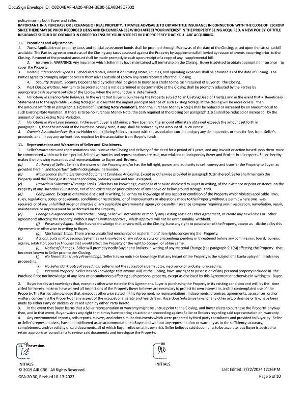 No Tenant Bankruptcy Proceedings . Seller has no notice or knowledge that any tenant of the Property is the subject of a bankruptcy or insolvency ( j ) proceeding. (k) ( l ) No Seller Bankruptcy Proceedings . Seller is not the subject of a bankruptcy, insolvency or probate proceeding. Personal Property . Seller has no knowledge that anyone will, at the Closing, have any right to possession of any personal property included in the Purchase Price nor knowledge of any liens or encumbrances affecting such personal property, except as disclosed by this Agreement or otherwise in writing to Buyer. 2. Buyer hereby acknowledges that, except as otherwise stated in this Agreement, Buyer is purchasing the Property in its existing condition and will, by the time called for herein, make or have waived all inspections of the Property Buyer believes are necessary to protect its own interest in, and its contemplated use of, the Property. The Parties acknowledge that, except as otherwise stated in this Agreement, no representations, inducements, promises, agreements, assurances, oral or written, concerning the Property, or any aspect of the occupational safety and health laws, Hazardous Substance laws, or any other act, ordinance or law, have been made by either Party or Brokers, or relied upon by either Party hereto. 3. In the event that Buyer learns that a Seller representation or warranty might be untrue prior to the Closing, and Buyer elects to purchase the Property anyway then, and in that event, Buyer waives any right that it may have to bring an action or proceeding against Seller or Brokers regarding said representation or warranty . 4. Any environmental reports, soils reports, surveys, and other similar documents which were prepared by third party consultants and provided to Buyer by Seller or Seller's representatives, have been delivered as an accommodation to Buyer and without any representation or warranty as to the sufficiency, accuracy, completeness, and/or validity of said documents, all of which Buyer relies on at its own risk. Seller believes said documents to be accurate, but Buyer is advised to retain appropriate consultants to review said documents and investigate the Property. DocuSign Envelope ID: C8D04BAF - 4A20 - 4FB4 - BE00 - 5EA6B43C7032 policy insuring both Buyer and Seller. IMPORTANT: IN A PURCHASE OR EXCHANGE OF REAL PROPERTY, IT MAY BE ADVISABLE TO OBTAIN TITLE INSURANCE IN CONNECTION WITH THE CLOSE OF ESCROW SINCE THERE MAY BE PRIOR RECORDED LIENS AND ENCUMBRANCES WHICH AFFECT YOUR INTEREST IN THE PROPERTY BEING ACQUIRED. A NEW POLICY OF TITLE INSURANCE SHOULD BE OBTAINED IN ORDER TO ENSURE YOUR INTEREST IN THE PROPERTY THAT YOU ARE ACQUIRING. 11. Prorations and Adjustments. 1. Taxes . Applicable real property taxes and special assessment bonds shall be prorated through Escrow as of the date of the Closing, based upon the latest tax bill available. The Parties agree to prorate as of the Closing any taxes assessed against the Property by supplemental bill levied by reason of events occurring prior to the Closing. Payment of the prorated amount shall be made promptly in cash upon receipt of a copy of any supplemental bill. 2. Insurance . WARNING : Any insurance which Seller may have maintained will terminate on the Closing. Buyer is advised to obtain appropriate insurance to cover the Property. 3. Rentals, Interest and Expenses . Scheduled rentals, interest on Existing Notes, utilities, and operating expenses shall be prorated as of the date of Closing. The Parties agree to promptly adjust between themselves outside of Escrow any rents received after the Closing. 4. Security Deposit . Security Deposits held by Seller shall be given to Buyer as a credit to the cash required of Buyer at the Closing. 5. Post Closing Matters . Any item to be prorated that is not determined or determinable at the Closing shall be promptly adjusted by the Parties by appropriate cash payment outside of the Escrow when the amount due is determined. 6. Variations in Existing Note Balances . In the event that Buyer is purchasing the Property subject to an Existing Deed of Trust(s), and in the event that a Beneficiary Statement as to the applicable Existing Note(s) discloses that the unpaid principal balance of such Existing Note(s) at the closing will be more or less than the amount set forth in paragraph 3.1(c) hereof (" Existing Note Variation "), then the Purchase Money Note(s) shall be reduced or increased by an amount equal to such Existing Note Variation. If there is to be no Purchase Money Note, the cash required at the Closing per paragraph 3.1(a) shall be reduced or increased by the amount of such Existing Note Variation. 7. Variations in New Loan Balance . In the event Buyer is obtaining a New Loan and the amount ultimately obtained exceeds the amount set forth in paragraph 5.1, then the amount of the Purchase Money Note, if any, shall be reduced by the amount of such excess. 8. Owner's Association Fees . Escrow Holder shall: (i) bring Seller's account with the association current and pay any delinquencies or transfer fees from Seller's proceeds, and (ii) pay any up front fees required by the association from Buyer's funds. 11. Representations and Warranties of Seller and Disclaimers. 1. Seller's warranties and representations shall survive the Closing and delivery of the deed for a period of 3 years, and any lawsuit or action based upon them must be commenced within such time period. Seller's warranties and representations are true, material and relied upon by Buyer and Brokers in all respects. Seller hereby makes the following warranties and representations to Buyer and Brokers: (a) Authority of Seller . Seller is the owner of the Property and/or has the full right, power and authority to sell, convey and transfer the Property to Buyer as provided herein, and to perform Seller's obligations hereunder. (b) Maintenance During Escrow and Equipment Condition At Closing . Except as otherwise prov