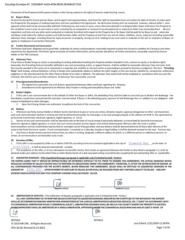 Buyer's Initials Seller's Initials 22. ARBITRATION OF DISPUTES. (This Arbitration of Disputes paragraph is applicable only if initialed by both Parties.) 22.1 ANY CONTROVERSY AS TO WHETHER SELLER IS ENTITLED TO LIQUIDATED DAMAGES AND/OR BUYER IS ENTITLED TO THE RETURN OF THE DEPOSIT SHALL BE DETERMINED BY BINDING ARBITRATION ADMINISTERED BY THE JUDICIAL ARBITRATION & MEDIATION SERVICES, INC. ("JAMS") IN ACCORDANCE WITH ITS COMMERCIAL ARBITRATION RULES ("COMMERCIAL RULES"). ARBITRATION HEARINGS SHALL BE HELD IN THE COUNTY WHERE THE PROPERTY IS LOCATED. SUCH CONTROVERSY SHALL BE ARBITRATED BY A SINGLE ARBITRATOR, APPOINTED UNDER THE COMMERCIAL RULES WHO HAS HAD AT LEAST 5 YEARS OF DocuSign Envelope ID: C8D04BAF - 4A20 - 4FB4 - BE00 - 5EA6B43C7032 Possession of the Property shall be given to Buyer at the Closing subject to the rights of tenants under Existing Leases. 14. Buyer's Entry. At any time during the Escrow period, Buyer, and its agents and representatives, shall have the right at reasonable times and subject to rights of tenants, to enter upon the Property for the purpose of making inspections and tests specified in this Agreement. No destructive testing shall be conducted, however, without Seller's prior approval which shall not be unreasonably withheld. Following any such entry or work, unless otherwise directed in writing by Seller, Buyer shall return the Property to the condition it was in prior to such entry or work, including the re - compaction or removal of any disrupted soil or material as Seller may reasonably direct. All such inspections and tests and any other work conducted or materials furnished with respect to the Property by or for Buyer shall be paid for by Buyer as and when due and Buyer shall indemnify, defend, protect and hold harmless Seller and the Property of and from any and all claims, liabilities, losses, expenses (including reasonable attorneys' fees), damages, including those for injury to person or property, arising out of or relating to any such work or materials or the acts or omissions of Buyer, its agents or employees in connection therewith . 15. Further Documents and Assurances. The Parties shall each, diligently and in good faith, undertake all actions and procedures reasonably required to place the Escrow in condition for Closing as and when required by this Agreement. The Parties agree to provide all further information, and to execute and deliver all further documents, reasonably required by Escrow Holder or the Title Company. 16. Attorneys' Fees. If any Party or Broker brings an action or proceeding (including arbitration) involving the Property whether founded in tort, contract or equity, or to declare rights hereunder, the Prevailing Party (as hereafter defined) in any such proceeding, action, or appeal thereon, shall be entitled to reasonable attorneys' fees and costs. Such fees may be awarded in the same suit or recovered in a separate suit, whether or not such action or proceeding is pursued to decision or judgment. The term " Prevailing Party " shall include, without limitation, a Party or Broker who substantially obtains or defeats the relief sought, as the case may be, whether by compromise, settlement, judgment, or the abandonment by the other Party or Broker of its claim or defense. The attorneys' fees award shall not be computed in accordance with any court fee schedule, but shall be such as to fully reimburse all attorneys' fees reasonably incurred. 17. Prior Agreements/Amendments. 1. This Agreement supersedes any and all prior agreements between Seller and Buyer regarding the Property. 2. Amendments to this Agreement are effective only if made in writing and executed by Buyer and Seller. 18. Broker's Rights. 1. If this sale is not consummated due to the default of either the Buyer or Seller, the defaulting Party shall be liable to and shall pay to Brokers the Brokerage Fee that Brokers would have received had the sale been consummated . If Buyer is the defaulting party, payment of said Brokerage Fee is in addition to any obligation with respect to liquidated or other damages . 2. Upon the Closing, Brokers are authorized to publicize the facts of this transaction. 19. Notices. 1. Whenever any Party, Escrow Holder or Brokers herein shall desire to give or serve any notice, demand, request, approval, disapproval or other communication, each such communication shall be in writing and shall be delivered personally, by messenger, or by mail, postage prepaid, to the address set forth in this agreement or by facsimile transmission, electronic signature, digital signature, or email. 2. Service of any such communication shall be deemed made on the date of actual receipt if personally delivered, or transmitted by facsimile transmission, electronic signature, digital signature, or email. Any such communication sent by regular mail shall be deemed given 48 hours after the same is mailed. Communications sent by United States Express Mail or overnight courier that guarantee next day delivery shall be deemed delivered 24 hours after delivery of the same to the Postal Service or courier. If such communication is received on a Saturday, Sunday or legal holiday, it shall be deemed received on the next business day. 3. Any Party or Broker hereto may from time to time, by notice in writing, designate a different address to which, or a different person or additional persons to whom, all communications are thereafter to be made. 20. Duration of Offer. 1. If this offer is not accepted by Seller on or before 5:00 P.M. according to the time standard applicable to the city of Diamond Bar on the date of 2/22/2024 , it shall be deemed automatically revoked. 2. The acceptance of this offer, or of any subsequent counteroffer hereto, that creates an agreement between the Parties as described in paragraph 1.2, shall be deemed made upon delivery to the other Party or either Broker herein of a duly executed writing unconditionally accepting the last outstanding of