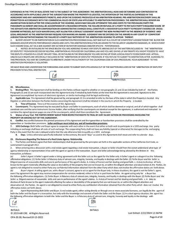 Buyer's Initials Seller's Initials 23. Miscellaneous. 1. Binding Effect . This Agreement shall be binding on the Parties without regard to whether or not paragraphs 21 and 22 are initialed by both of the Parties. Paragraphs 21 and 22 are each incorporated into this Agreement only if initialed by both Parties at the time that the Agreement is executed. Signatures to this Agreement accomplished by means of electronic signature or similar technology shall be legal and binding. 2. Applicable Law . This Agreement shall be governed by, and paragraph 22.3 is amended to refer to, the laws of the state in which the Property is located. Any litigation or arbitration between the Parties hereto concerning this Agreement shall be initiated in the county in which the Property is located. 3. Time of Essence . Time is of the essence of this Agreement. 4. Counterparts . This Agreement may be executed by Buyer and Seller in counterparts, each of which shall be deemed an original, and all of which together shall constitute one and the same instrument. Escrow Holder, after verifying that the counterparts are identical except for the signatures, is authorized and instructed to combine the signed signature pages on one of the counterparts, which shall then constitute the Agreement. 5. Waiver of Jury Trial . THE PARTIES HEREBY WAIVE THEIR RESPECTIVE RIGHTS TO TRIAL BY JURY IN ANY ACTION OR PROCEEDING INVOLVING THE PROPERTY OR ARISING OUT OF THIS AGREEMENT. 6. Conflict . Any conflict between the printed provisions of this Agreement and the typewritten or handwritten provisions shall be controlled by the typewritten or handwritten provisions. Seller and Buyer must initial any and all handwritten provisions . 7. 1031 Exchange . Both Seller and Buyer agree to cooperate with each other in the event that either or both wish to participate in a 1031 exchange. Any party initiating an exchange shall bear all costs of such exchange. The cooperating Party shall not have any liability (special or otherwise) for damages to the exchanging Party in the event that the sale is delayed and/or that the sale otherwise fails to qualify as a 1031 exchange. 8. Days . Unless otherwise specifically indicated to the contrary, the word "days" as used in this Agreement shall mean and refer to calendar days. 23. Disclosures Regarding The Nature of a Real Estate Agency Relationship. 1. The Parties and Brokers agree that their relationship(s) shall be governed by the principles set forth in the applicable sections of the California Civil Code, as summarized in paragraph 24.2. 2. When entering into a discussion with a real estate agent regarding a real estate transaction, a Buyer or Seller should from the outset understand what type of agency relationship or representation it has with the agent or agents in the transaction. Buyer and Seller acknowledge being advised by the Brokers in this transaction, as follows: (a) Seller's Agent . A Seller's agent under a listing agreement with the Seller acts as the agent for the Seller only. A Seller's agent or subagent has the following affirmative obligations: (1) To the Seller: A fiduciary duty of utmost care, integrity, honesty, and loyalty in dealings with the Seller. (2) To the Buyer and the Seller: a. Diligent exercise of reasonable skills and care in performance of the agent's duties. b. A duty of honest and fair dealing and good faith. c. A duty to disclose all facts known to the agent materially affecting the value or desirability of the property that are not known to, or within the diligent attention and observation of, the Parties. An agent is not obligated to reveal to either Party any confidential information obtained from the other Party which does not involve the affirmative duties set forth above. (b) Buyer's Agent . A selling agent can, with a Buyer's consent, agree to act as agent for the Buyer only. In these situations, the agent is not the Seller's agent, even if by agreement the agent may receive compensation for services rendered, either in full or in part from the Seller. An agent acting only for a Buyer has the following affirmative obligations. (1) To the Buyer: A fiduciary duty of utmost care, integrity, honesty, and loyalty in dealings with the Buyer. (2) To the Buyer and the Seller: a. Diligent exercise of reasonable skills and care in performance of the agent's duties. b. A duty of honest and fair dealing and good faith. c. A duty to disclose all facts known to the agent materially affecting the value or desirability of the property that are not known to, or within the diligent attention and observation of, the Parties. An agent is not obligated to reveal to either Party any confidential information obtained from the other Party which does not involve the affirmative duties set forth above. (c) Agent Representing Both Seller and Buyer . A real estate agent, either acting directly or through one or more associate licensees, can legally be the agent of both the Seller and the Buyer in a transaction, but only with the knowledge and consent of both the Seller and the Buyer. (1) In a dual agency situation, the agent has the following affirmative obligations to both the Seller and the Buyer: a. A fiduciary duty of utmost care, integrity, honesty and loyalty in the dealings with DocuSign Envelope ID: C8D04BAF - 4A20 - 4FB4 - BE00 - 5EA6B43C7032 EXPERIENCE IN THE TYPE OF REAL ESTATE THAT IS THE SUBJECT OF THIS AGREEMENT. THE ARBITRATOR SHALL HEAR AND DETERMINE SAID CONTROVERSY IN ACCORDANCE WITH APPLICABLE LAW OF THE JURISDICTION WHERE THE PROPERTY IS LOCATED, THE INTENTION OF THE PARTIES AS EXPRESSED IN THIS AGREEMENT AND ANY AMENDMENTS THERETO, AND UPON THE EVIDENCE PRODUCED AT AN ARBITRATION HEARING. PRE - ARBITRATION DISCOVERY SHALL BE PERMITTED IN ACCORDANCE WITH THE COMMERCIAL RULES OR STATE LAW APPLICABLE TO ARBITRATION PROCEEDINGS. THE ARBITRATOR SHALL RENDER AN AWARD WITHIN 30 DAYS AFTER THE CONCLUSION OF THE HEARING, WHICH MAY INCLUDE ATTORNEYS' FEES AND COSTS TO THE PREV