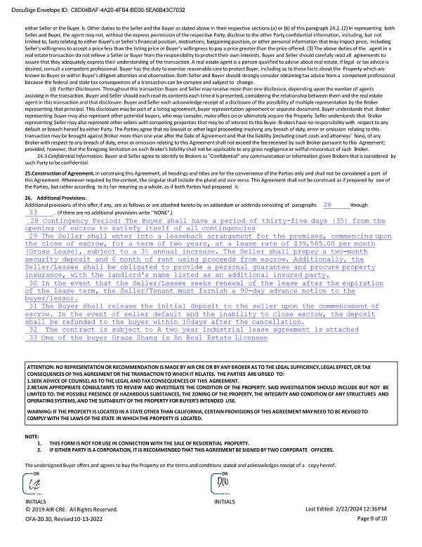 ATTENTION: NO REPRESENTATION OR RECOMMENDATION IS MADE BY AIR CRE OR BY ANY BROKER AS TO THE LEGAL SUFFICIENCY, LEGAL EFFECT, OR TAX CONSEQUENCES OF THIS AGREEMENT OR THE TRANSACTION TO WHICH IT RELATES. THE PARTIES ARE URGED TO: 1. SEEK ADVICE OF COUNSEL AS TO THE LEGAL AND TAX CONSEQUENCES OF THIS AGREEMENT . 2. RETAIN APPROPRIATE CONSULTANTS TO REVIEW AND INVESTIGATE THE CONDITION OF THE PROPERTY . SAID INVESTIGATION SHOULD INCLUDE BUT NOT BE LIMITED TO : THE POSSIBLE PRESENCE OF HAZARDOUS SUBSTANCES, THE ZONING OF THE PROPERTY, THE INTEGRITY AND CONDITION OF ANY STRUCTURES AND OPERATING SYSTEMS, AND THE SUITABILITY OF THE PROPERTY FOR BUYER'S INTENDED USE . WARNING: IF THE PROPERTY IS LOCATED IN A STATE OTHER THAN CALIFORNIA, CERTAIN PROVISIONS OF THIS AGREEMENT MAY NEED TO BE REVISED TO COMPLY WITH THE LAWS OF THE STATE IN WHICH THE PROPERTY IS LOCATED. NOTE: 1. THIS FORM IS NOT FOR USE IN CONNECTION WITH THE SALE OF RESIDENTIAL PROPERTY. 2. IF EITHER PARTY IS A CORPORATION, IT IS RECOMMENDED THAT THIS AGREEMENT BE SIGNED BY TWO CORPORATE OFFICERS. The undersigned Buyer offers and agrees to buy the Property on the terms and conditions stated and acknowledges receipt of a copy hereof. DocuSign Envelope ID: C8D04BAF - 4A20 - 4FB4 - BE00 - 5EA6B43C7032 either Seller or the Buyer. b. Other duties to the Seller and the Buyer as stated above in their respective sections (a) or (b) of this paragraph 24.2. (2) In representing both Seller and Buyer, the agent may not, without the express permission of the respective Party, disclose to the other Party confidential information, including, but not limited to, facts relating to either Buyer's or Seller's financial position, motivations, bargaining position, or other personal information that may impact price, including Seller's willingness to accept a price less than the listing price or Buyer's willingness to pay a price greater than the price offered. (3) The above duties of the agent in a real estate transaction do not relieve a Seller or Buyer from the responsibility to protect their own interests. Buyer and Seller should carefully read all agreements to assure that they adequately express their understanding of the transaction. A real estate agent is a person qualified to advise about real estate. If legal or tax advice is desired, consult a competent professional. Buyer has the duty to exercise reasonable care to protect Buyer, including as to those facts about the Property which are known to Buyer or within Buyer's diligent attention and observation. Both Seller and Buyer should strongly consider obtaining tax advice from a competent professional because the federal and state tax consequences of a transaction can be complex and subject to change. (d) Further Disclosures . Throughout this transaction Buyer and Seller may receive more than one disclosure, depending upon the number of agents assisting in the transaction. Buyer and Seller should each read its contents each time it is presented, considering the relationship between them and the real estate agent in this transaction and that disclosure. Buyer and Seller each acknowledge receipt of a disclosure of the possibility of multiple representation by the Broker representing that principal. This disclosure may be part of a listing agreement, buyer representation agreement or separate document. Buyer understands that Broker representing Buyer may also represent other potential buyers, who may consider, make offers on or ultimately acquire the Property. Seller understands that Broker representing Seller may also represent other sellers with competing properties that may be of interest to this Buyer. Brokers have no responsibility with respect to any default or breach hereof by either Party. The Parties agree that no lawsuit or other legal proceeding involving any breach of duty, error or omission relating to this transaction may be brought against Broker more than one year after the Date of Agreement and that the liability (including court costs and attorneys' fees), of any Broker with respect to any breach of duty, error or omission relating to this Agreement shall not exceed the fee received by such Broker pursuant to this Agreement; provided, however, that the foregoing limitation on each Broker's liability shall not be applicable to any gross negligence or willful misconduct of such Broker. 24.3 Confidential Information . Buyer and Seller agree to identify to Brokers as "Confidential" any communication or information given Brokers that is considered by such Party to be confidential. 25. Construction of Agreement. In construing this Agreement, all headings and titles are for the convenience of the Parties only and shall not be considered a part of this Agreement. Whenever required by the context, the singular shall include the plural and vice versa. This Agreement shall not be construed as if prepared by one of the Parties, but rather according to its fair meaning as a whole, as if both Parties had prepared it. 26. Additional Provisions. Additional provisions of this offer, if any, are as follows or are attached hereto by an addendum or addenda consisting of paragraphs 28 through 33 . (If there are no additional provisions write "NONE".) 28 Contingency Period: The Buyer shall have a period of thirty - five days (35) from the opening of escrow to satisfy itself of all contingencies 29 The Seller shall enter into a leaseback arrangement for the premises, commencing upon the close of escrow, for a term of two years, at a lease rate of $39,585.00 per month (Gross Lease), subject to a 3% annual increase. The Seller shall prepay a two - month security deposit and 6 month of rent using proceeds from escrow. Additionally, the Seller/Lessee shall be obligated to provide a personal guarantee and procure property insurance, with the landlord's name listed as an additional insured party. 30 In the event that the Seller/Lessee seeks renewal of the lease after the expiration of the lease term, the Se