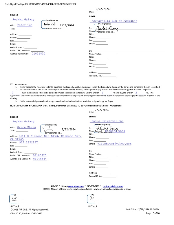 BROKER Re/Max Galaxy Attn: Peter Loh Title: Address: Phone: Fax: Email: Federal ID No.: Broker DRE License #: Agent DRE License #: 01031835 BUYER 620Magnolia LLC or Assignee By: Name Printed: Title: Phone: Fax: Email: By: Name Printed: Title: Phone: Fax: Email: Address: Federal ID No.: 27. Acceptance. 1. Seller accepts the foregoing offer to purchase the Property and hereby agrees to sell the Property to Buyer on the terms and conditions therein specified. 2. In consideration of real estate brokerage service rendered by Brokers, Seller agrees to pay Brokers a real estate Brokerage Fee in a sum equal to 3 % of the Purchase Price to be divided between the Brokers as follows: Seller's Broker 1 % and Buyer's Broker 2 %. This Agreement shall serve as an irrevocable instruction to Escrow Holder to pay such Brokerage Fee to Brokers out of the proceeds accruing to the account of Seller at the Closing. 3. Seller acknowledges receipt of a copy hereof and authorizes Brokers to deliver a signed copy to Buyer. NOTE: A PROPERTY INFORMATION SHEET IS REQUIRED TO BE DELIVERED TO BUYER BY SELLER UNDER THIS AGREEMENT. BROKER Re/Max Galaxy Attn: Grace Zhang Title: Address: 1411 S Diamond Bar Blvd, Diamond Bar, CA 91765 Phone: 909.2232297 Fax: Email: Federal ID No.: Broker DRE License #: 02185725 Agent's DRE License #: 01946544 Date: SELLER Focus Universal Inc By: Name Printed: Desheng Wang Title: Phone: Fax: Email: Vitashower@yahoo.com By: Name Printed: Title: Phone: Fax: Email: Address: Federal ID No.: AIR CRE * https:// www.aircre.com * 213 - 687 - 8777 * contracts@aircre.com NOTICE: No part of these works may be reproduced in any form without permission in writing. DocuSign Envelope ID: C8D04BAF - 4A20 - 4FB4 - BE00 - 5EA6B43C7032 2/22/2024 D a t e : 2/22/2024 2/22/2024 2/22/2024 **I - Buyer1** * * I - B u y e r2 ** INITIALS © 2019 AIR CRE. All Rights Reserved. OFA - 20.30, Revised 10 - 13 - 2022 **I - Seller1** * * I - S e l l e r2 ** INITIALS Last Edited: 2/22/2024 12:36 PM Page 10 of 10