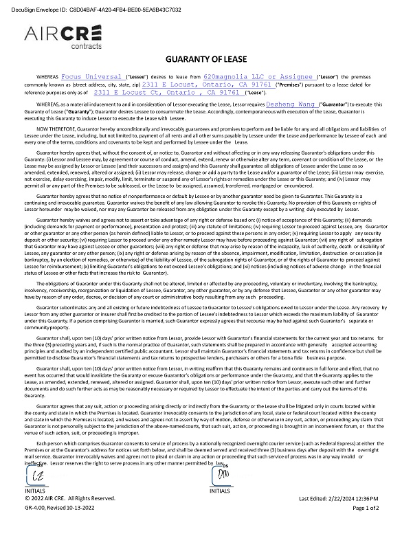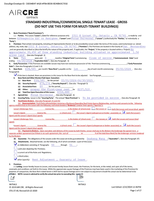 STANDARD INDUSTRIAL/COMMERCIAL SINGLE - TENANT LEASE - GROSS (DO NOT USE THIS FORM FOR MULTI - TENANT BUILDINGS) 1. Basic Provisions ("Basic Provisions"). 1.1 Parties. This Lease (" Lease "), dated for reference purposes only 2311 E Locust Ct, Ontario , CA 91761 , is made by and between 620magnolia LLC or Assignee (" Lessor ") and Focus Universal (" Lessee "), (collectively the " Parties ," or individually a " Party "). 2. Premises: That certain real property, including all improvements therein or to be provided by Lessor under the terms of this Lease, commonly known as (street address, city, state, zip): 2311 E Locust, Ontario, CA 91761 (" Premises "). The Premises are located in the County of San Bernardino , and are generally described as (describe briefly the nature of the property and , if applicable, the " Project ," if the property is located within a Project): An approximate 30,450 sf free standing industrial building situated on approximated 1.56 acres land . (See also Paragraph 2) 3. Term: Two years and 0 months (" Original Term ") commencing Close of escrow (" Commencement Date ") and ending 04/30/2026 (" Expiration Date "). (See also Paragraph 3) 4. Early Possession: If the Premises are available Lessee may have non - exclusive possession of the Premises commencing (" Early Possession Date "). (See also Paragraphs 3.2 and 3.3) 5. Base Rent: $39,585 per month (" Base Rent "), payable on the 1st day of each month commencing 05/01/2024 . (See also Paragraph 4) If this box is checked, there are provisions in this Lease for the Base Rent to be adjusted. See Paragraph . 6. Base Rent and Other Monies Paid Upon Execution: (a) Base Rent: $39,585 for the period 05/01/2024~04/30/2025 . (b) Security Deposit: $79,170 (" Security Deposit "). (See also Paragraph 5) (c) Association Fees : $0 for the period . (d) Other: prepay the first - year rent for $237,510 . (e) Total Due Upon Execution of this Lease: $316,680 . 7. Agreed Use : Focus Universal . (See also Paragraph 6) 8. Insuring Party. Lessor is the " Insuring Party ". The annual " Base Premium " is To be provided in escrow . (See also Paragraph 8) 9. Real Estate Brokers. (See also Paragraph 15 and 25) (a) Representation : Each Party acknowledges receiving a Disclosure Regarding Real Estate Agency Relationship, confirms and consents to the following agency relationships in this Lease with the following real estate brokers (" Broker(s) ") and/or their agents ("Agent(s)"): Lessor's Brokerage Firm License No. Is the broker of (check one): the Lessor; or both the Lessee and Lessor (dual agent) . Lessor's Agent License No. is (check one): the Lessor's Agent (salesperson or broker associate); or both the Lessee's Agent and the Lessor's Agent (dual agent). Lessee's Brokerage Firm License No. Is the broker of (check one): the Lessee; or both the Lessee and Lessor (dual agent) . L essee's Agent License No. is (check one): the Lessee's Agent (salesperson or broker associate); or both the Lessee's Agent and the Lessor's Agent (dual agent). (b) Payment to Brokers. Upon execution and delivery of this Lease by both Parties, Lessor shall pay to the Brokers the brokerage fee agreed to in a separate written agreement (or if there is no such agreement, the sum of or % of the total Base Rent) for the brokerage services rendered by the Brokers . 10. Guarantor. The obligations of the Lessee under this Lease are to be guaranteed by Desheng Wang (" Guarantor "). (See also Paragraph 37) 11. Attachments. Attached hereto are the following, all of which constitute a part of this Lease: an Addendum consisting of Paragraphs 50 through 51 ; a plot plan depicting the Premises; a current set of the Rules and Regulations; a Work Letter; other (specify): Rent Adjustment , Guaranty of lease . 2. Premises. 2.1 Letting . Lessor hereby leases to Lessee, and Lessee hereby leases from Lessor, the Premises, for the term, at the rental, and upon all of the terms, covenants and conditions set forth in this Lease. While the approximate square footage of the Premises may have been used in the marketing of the Premises for purposes of comparison, the Base Rent stated herein is NOT tied to square footage and is not subject to adjustment should the actual size be determined to be different. NOTE: Lessee is advised to verify the actual size prior to executing this Lease. DocuSign Envelope ID: C8D04BAF - 4A20 - 4FB4 - BE00 - 5EA6B43C7032 **I - Lessor1** * * I - L e ss o r 2 * * INITIALS © 2019 AIR CRE. All Rights Reserved. STG - 27.40, Revised 10 - 22 - 2020 **I - Lessee1** * * I - Le s se e 2 ** INITIALS Last Edited: 2/22/2024 12:36 PM Page 1 of 17