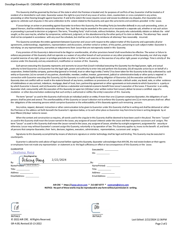 GUARANTOR Desheng Wang Executed At: On: Name Printed: Title: Address: Email Address: Name Printed: Title: Address: Email Address: AIR CRE * https:// www.aircre.com * 213 - 687 - 8777 * contracts@aircre.com NOTICE: No part of these works may be reproduced in any form without permission in writing. DocuSign Envelope ID: C8D04BAF - 4A20 - 4FB4 - BE00 - 5EA6B43C7032 This Guaranty shall be governed by the laws of the state in which the Premises is located and, for purposes of conflicts of law, Guarantor shall be treated as if resident of or domiciled in such state. Guarantor waives the right to a jury trial of any cause of action, claim, counterclaim or cross - complaint in any action, proceeding or other hearing brought against Guarantor. If and to the extent the Lease requires Lessor and Lessee to arbitrate any disputes, then Guarantor also agrees to arbitrate such disputes in the same arbitration to the extent related to the Guaranty and upon the same terms and conditions provided in the Lease. If Lessor brings an action or proceeding against Guarantor to enforce this Guaranty, the Prevailing Party (as hereafter defined) in any such proceeding, action, or appeal thereon, shall be entitled to reasonable attorneys' fees. Such fees may be awarded in the same suit or recovered in a separate suit, whether or not such action or proceeding is pursued to decision or judgment. The term, "Prevailing Party" shall include, without limitation, the party who substantially obtains or defeats the relief sought, as the case may be, whether by compromise, settlement, judgment, or the abandonment by the other party of its claim or defense. The attorneys' fees award shall not be computed in accordance with any court fee schedule, but shall be such as to fully reimburse all attorneys' fees reasonably incurred. This Guaranty constitutes the entire agreement between Guarantor and Lessor with respect to the subject matter of this Guaranty and supersedes all prior agreements, understandings, negotiations, representations and discussions, whether verbal or written, of the parties, pertaining to such subject matter. Guarantor is not relying on any representations, warranties or inducements from Lessor that are not expressly stated in this Guaranty. If any provision of this Guaranty is determined to be illegal or unenforceable, all other provisions hereof shall nevertheless be effective. The waiver or failure to enforce any provision of this Guaranty shall not operate as a waiver of any other breach of such provision or any other provisions of this Guaranty, nor shall any single or partial exercise of any right, power or privilege preclude any other or further such exercise or the exercise of any other right, power or privilege. Time is strictly of the essence under this Guaranty and any amendment, modification or revision of this Guaranty. Each person executing this Guaranty represents and warrants to Lessor that (i) each individual executing this Guaranty has the legal power, right, and actual authority to bind Guarantor; (ii) Guarantor has the legal right, power and authority to enter into and perform this Guaranty; (iii) all requisite action by or on behalf of a corporation, limited liability company, partnership (general or limited), trust or other legal entity ("entity") has been taken for this Guaranty to be duly authorized by such entity or Guarantor; (vi) no consent of any partner, shareholder, member, creditor, investor, government, judicial or administrative body or other party is required in connection with Guarantor executing this Guaranty; (v) this Guaranty is a valid and legally binding obligation of Guarantor; (vi) the execution and delivery of this Guaranty does not conflict with or result in the material breach of any terms, conditions or provisions of, or constitute a default under, any bond, note, or other evidence of indebtedness or any contract, indenture, mortgage, deed of trust, loan, partnership agreement or other agreements or instruments to which Guarantor is a party or by which Guarantor is bound; and (vi) Guarantor will derive a substantial and material economic benefit from Lessor's execution of the Lease. If Guarantor is an entity, Guarantor shall, concurrently with the execution of this Guaranty (or upon ten (10) days' prior written notice from Lessor), deliver to Lessor a certified copy of a resolution or other documentation evidencing that such entity is authorized or ratifies the entity's execution of this Guaranty. The term "person" as used in this Guaranty shall include an individual and/or an entity. If more than one (1) person comprises Guarantor, the obligations of such persons shall be joint and several. The unenforceability of this Guaranty or Lessor's election not to enforce this Guaranty against one (1) or more persons shall not affect the obligations of the remaining persons which comprise Guarantor or the enforceability of this Guaranty against such remaining persons. Any notice, request, demand, instruction or other communication to be given to Guarantor under this Guaranty shall be in writing and shall be delivered at either the Premises or the address set forth beneath the Guarantor's signature below, or to such other place as Guarantor may from time to time in writing designate by at least fifteen (15) days' notice to Lessor. When the context and construction so requires, all words used in the singular in this Guaranty shall be deemed to have been used in the plural. The term "Lessee" as used in this Guaranty shall mean the Lessee named in the Lease, any assignee of Lessee's interest under the Lease and their respective successors and assigns. The term "Lessor" as used in this Guaranty shall mean the Lessor named in the Lease, any assignee of Lessor, whether by outright assignment, assignment for security or otherwise. Lessor may without Guarantor's consent assign this Guaranty, voluntarily or by operation of law. This Guaranty applies to, inures to the benefit of, an