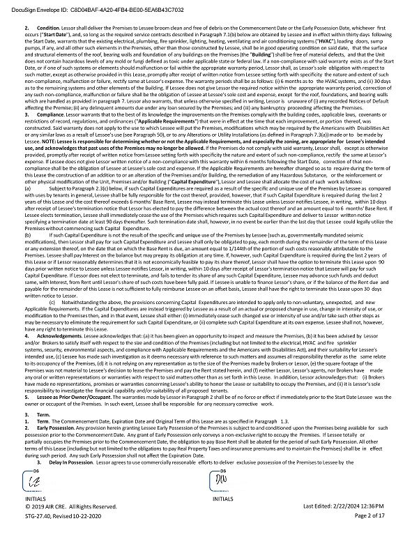DocuSign Envelope ID: C8D04BAF - 4A20 - 4FB4 - BE00 - 5EA6B43C7032 2. Condition . Lessor shall deliver the Premises to Lessee broom clean and free of debris on the Commencement Date or the Early Possession Date, whichever first occurs (" Start Date "), and, so long as the required service contracts described in Paragraph 7.1(b) below are obtained by Lessee and in effect within thirty days following the Start Date, warrants that the existing electrical, plumbing, fire sprinkler, lighting, heating, ventilating and air conditioning systems (" HVAC "), loading doors, sump pumps, if any, and all other such elements in the Premises, other than those constructed by Lessee, shall be in good operating condition on said date, that the surface and structural elements of the roof, bearing walls and foundation of any buildings on the Premises (the " Building ") shall be free of material defects, and that the Unit does not contain hazardous levels of any mold or fungi defined as toxic under applicable state or federal law. If a non - compliance with said warranty exists as of the Start Date, or if one of such systems or elements should malfunction or fail within the appropriate warranty period, Lessor shall, as Lessor's sole obligation with respect to such matter, except as otherwise provided in this Lease, promptly after receipt of written notice from Lessee setting forth with specificity the nature and extent of such non - compliance, malfunction or failure, rectify same at Lessor's expense. The warranty periods shall be as follows: (i) 6 months as to the HVAC systems, and (ii) 30 days as to the remaining systems and other elements of the Building. If Lessee does not give Lessor the required notice within the appropriate warranty period, correction of any such non - compliance, malfunction or failure shall be the obligation of Lessee at Lessee's sole cost and expense, except for the roof, foundations, and bearing walls which are handled as provided in paragraph 7. Lessor also warrants, that unless otherwise specified in writing, Lessor is unaware of (i) any recorded Notices of Default affecting the Premise; (ii) any delinquent amounts due under any loan secured by the Premises; and (iii) any bankruptcy proceeding affecting the Premises. 3. Compliance . Lessor warrants that to the best of its knowledge the improvements on the Premises comply with the building codes, applicable laws, covenants or restrictions of record, regulations, and ordinances (" Applicable Requirements ") that were in effect at the time that each improvement, or portion thereof, was constructed. Said warranty does not apply to the use to which Lessee will put the Premises, modifications which may be required by the Americans with Disabilities Act or any similar laws as a result of Lessee's use (see Paragraph 50), or to any Alterations or Utility Installations (as defined in Paragraph 7.3(a)) made or to be made by Lessee. NOTE: Lessee is responsible for determining whether or not the Applicable Requirements, and especially the zoning, are appropriate for Lessee's intended use, and acknowledges that past uses of the Premises may no longer be allowed. If the Premises do not comply with said warranty, Lessor shall, except as otherwise provided, promptly after receipt of written notice from Lessee setting forth with specificity the nature and extent of such non - compliance, rectify the same at Lessor's expense. If Lessee does not give Lessor written notice of a non - compliance with this warranty within 6 months following the Start Date, correction of that non - compliance shall be the obligation of Lessee at Lessee's sole cost and expense. If the Applicable Requirements are hereafter changed so as to require during the term of this Lease the construction of an addition to or an alteration of the Premises and/or Building, the remediation of any Hazardous Substance, or the reinforcement or other physical modification of the Unit, Premises and/or Building (" Capital Expenditure "), Lessor and Lessee shall allocate the cost of such work as follows: (a) Subject to Paragraph 2.3(c) below, if such Capital Expenditures are required as a result of the specific and unique use of the Premises by Lessee as compared with uses by tenants in general, Lessee shall be fully responsible for the cost thereof, provided, however, that if such Capital Expenditure is required during the last 2 years of this Lease and the cost thereof exceeds 6 months' Base Rent, Lessee may instead terminate this Lease unless Lessor notifies Lessee, in writing, within 10 days after receipt of Lessee's termination notice that Lessor has elected to pay the difference between the actual cost thereof and an amount equal to 6 months' Base Rent. If Lessee elects termination, Lessee shall immediately cease the use of the Premises which requires such Capital Expenditure and deliver to Lessor written notice specifying a termination date at least 90 days thereafter. Such termination date shall, however, in no event be earlier than the last day that Lessee could legally utilize the Premises without commencing such Capital Expenditure. (b) If such Capital Expenditure is not the result of the specific and unique use of the Premises by Lessee (such as, governmentally mandated seismic modifications), then Lessor shall pay for such Capital Expenditure and Lessee shall only be obligated to pay, each month during the remainder of the term of this Lease or any extension thereof, on the date that on which the Base Rent is due, an amount equal to 1/144th of the portion of such costs reasonably attributable to the Premises. Lessee shall pay Interest on the balance but may prepay its obligation at any time. If, however, such Capital Expenditure is required during the last 2 years of this Lease or if Lessor reasonably determines that it is not economically feasible to pay its share thereof, Lessor shall have the option to terminate this Lease upon 90 days prior written notice to Lessee unless Les