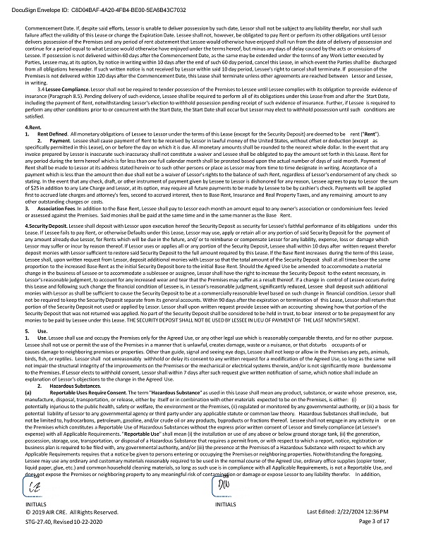 DocuSign Envelope ID: C8D04BAF - 4A20 - 4FB4 - BE00 - 5EA6B43C7032 Commencement Date. If, despite said efforts, Lessor is unable to deliver possession by such date, Lessor shall not be subject to any liability therefor, nor shall such failure affect the validity of this Lease or change the Expiration Date. Lessee shall not, however, be obligated to pay Rent or perform its other obligations until Lessor delivers possession of the Premises and any period of rent abatement that Lessee would otherwise have enjoyed shall run from the date of delivery of possession and continue for a period equal to what Lessee would otherwise have enjoyed under the terms hereof, but minus any days of delay caused by the acts or omissions of Lessee. If possession is not delivered within 60 days after the Commencement Date, as the same may be extended under the terms of any Work Letter executed by Parties, Lessee may, at its option, by notice in writing within 10 days after the end of such 60 day period, cancel this Lease, in which event the Parties shall be discharged from all obligations hereunder. If such written notice is not received by Lessor within said 10 day period, Lessee's right to cancel shall terminate. If possession of the Premises is not delivered within 120 days after the Commencement Date, this Lease shall terminate unless other agreements are reached between Lessor and Lessee, in writing. 3.4 Lessee Compliance . Lessor shall not be required to tender possession of the Premises to Lessee until Lessee complies with its obligation to provide evidence of insurance (Paragraph 8.5). Pending delivery of such evidence, Lessee shall be required to perform all of its obligations under this Lease from and after the Start Date, including the payment of Rent, notwithstanding Lessor's election to withhold possession pending receipt of such evidence of insurance. Further, if Lessee is required to perform any other conditions prior to or concurrent with the Start Date, the Start Date shall occur but Lessor may elect to withhold possession until such conditions are satisfied. 4. Rent. 1. Rent Defined . All monetary obligations of Lessee to Lessor under the terms of this Lease (except for the Security Deposit) are deemed to be rent (" Rent "). 2. Payment . Lessee shall cause payment of Rent to be received by Lessor in lawful money of the United States, without offset or deduction (except as specifically permitted in this Lease), on or before the day on which it is due. All monetary amounts shall be rounded to the nearest whole dollar. In the event that any invoice prepared by Lessor is inaccurate such inaccuracy shall not constitute a waiver and Lessee shall be obligated to pay the amount set forth in this Lease. Rent for any period during the term hereof which is for less than one full calendar month shall be prorated based upon the actual number of days of said month. Payment of Rent shall be made to Lessor at its address stated herein or to such other persons or place as Lessor may from time to time designate in writing. Acceptance of a payment which is less than the amount then due shall not be a waiver of Lessor's rights to the balance of such Rent, regardless of Lessor's endorsement of any check so stating. In the event that any check, draft, or other instrument of payment given by Lessee to Lessor is dishonored for any reason, Lessee agrees to pay to Lessor the sum of $25 in addition to any Late Charge and Lessor, at its option, may require all future payments to be made by Lessee to be by cashier's check. Payments will be applied first to accrued late charges and attorney's fees, second to accrued interest, then to Base Rent, Insurance and Real Property Taxes, and any remaining amount to any other outstanding charges or costs. 3. Association Fees . In addition to the Base Rent, Lessee shall pay to Lessor each month an amount equal to any owner's association or condominium fees levied or assessed against the Premises. Said monies shall be paid at the same time and in the same manner as the Base Rent. 4. Security Deposit. Lessee shall deposit with Lessor upon execution hereof the Security Deposit as security for Lessee's faithful performance of its obligations under this Lease. If Lessee fails to pay Rent, or otherwise Defaults under this Lease, Lessor may use, apply or retain all or any portion of said Security Deposit for the payment of any amount already due Lessor, for Rents which will be due in the future, and/ or to reimburse or compensate Lessor for any liability, expense, loss or damage which Lessor may suffer or incur by reason thereof. If Lessor uses or applies all or any portion of the Security Deposit, Lessee shall within 10 days after written request therefor deposit monies with Lessor sufficient to restore said Security Deposit to the full amount required by this Lease. If the Base Rent increases during the term of this Lease, Lessee shall, upon written request from Lessor, deposit additional monies with Lessor so that the total amount of the Security Deposit shall at all times bear the same proportion to the increased Base Rent as the initial Security Deposit bore to the initial Base Rent. Should the Agreed Use be amended to accommodate a material change in the business of Lessee or to accommodate a sublessee or assignee, Lessor shall have the right to increase the Security Deposit to the extent necessary, in Lessor's reasonable judgment, to account for any increased wear and tear that the Premises may suffer as a result thereof. If a change in control of Lessee occurs during this Lease and following such change the financial condition of Lessee is, in Lessor's reasonable judgment, significantly reduced, Lessee shall deposit such additional monies with Lessor as shall be sufficient to cause the Security Deposit to be at a commercially reasonable level based on such change in financial condition. Lessor shall not be required to keep the Security Deposit separate from its general accounts. Wi