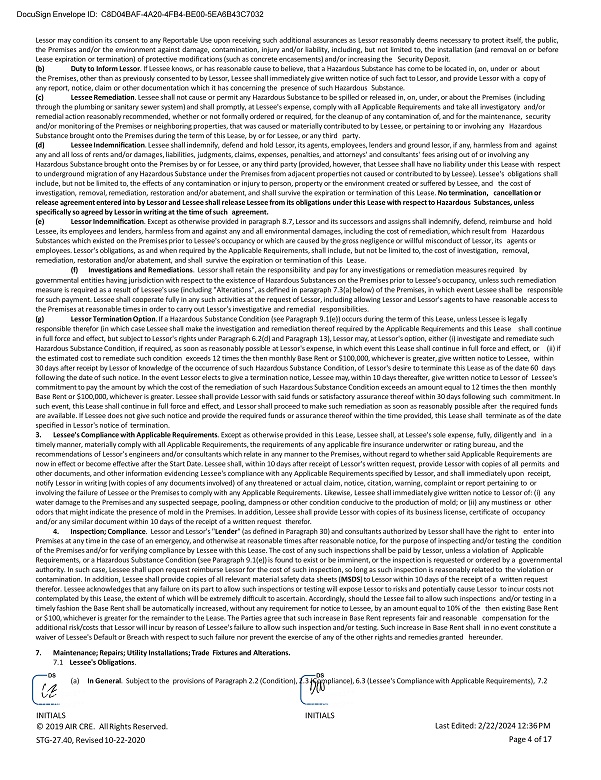 DocuSign Envelope ID: C8D04BAF - 4A20 - 4FB4 - BE00 - 5EA6B43C7032 Lessor may condition its consent to any Reportable Use upon receiving such additional assurances as Lessor reasonably deems necessary to protect itself, the public, the Premises and/or the environment against damage, contamination, injury and/or liability, including, but not limited to, the installation (and removal on or before Lease expiration or termination) of protective modifications (such as concrete encasements) and/or increasing the Security Deposit . (b) Duty to Inform Lessor . If Lessee knows, or has reasonable cause to believe, that a Hazardous Substance has come to be located in, on, under or about the Premises, other than as previously consented to by Lessor, Lessee shall immediately give written notice of such fact to Lessor, and provide Lessor with a copy of any report, notice, claim or other documentation which it has concerning the presence of such Hazardous Substance. (c) Lessee Remediation . Lessee shall not cause or permit any Hazardous Substance to be spilled or released in, on, under, or about the Premises (including through the plumbing or sanitary sewer system) and shall promptly, at Lessee's expense, comply with all Applicable Requirements and take all investigatory and/or remedial action reasonably recommended, whether or not formally ordered or required, for the cleanup of any contamination of, and for the maintenance, security and/or monitoring of the Premises or neighboring properties, that was caused or materially contributed to by Lessee, or pertaining to or involving any Hazardous Substance brought onto the Premises during the term of this Lease, by or for Lessee, or any third party. (d) Lessee Indemnification . Lessee shall indemnify, defend and hold Lessor, its agents, employees, lenders and ground lessor, if any, harmless from and against any and all loss of rents and/or damages, liabilities, judgments, claims, expenses, penalties, and attorneys' and consultants' fees arising out of or involving any Hazardous Substance brought onto the Premises by or for Lessee, or any third party (provided, however, that Lessee shall have no liability under this Lease with respect to underground migration of any Hazardous Substance under the Premises from adjacent properties not caused or contributed to by Lessee). Lessee's obligations shall include, but not be limited to, the effects of any contamination or injury to person, property or the environment created or suffered by Lessee, and the cost of investigation, removal, remediation, restoration and/or abatement, and shall survive the expiration or termination of this Lease. No termination, cancellation or release agreement entered into by Lessor and Lessee shall release Lessee from its obligations under this Lease with respect to Hazardous Substances, unless specifically so agreed by Lessor in writing at the time of such agreement. (e) Lessor Indemnification . Except as otherwise provided in paragraph 8.7, Lessor and its successors and assigns shall indemnify, defend, reimburse and hold Lessee, its employees and lenders, harmless from and against any and all environmental damages, including the cost of remediation, which result from Hazardous Substances which existed on the Premises prior to Lessee's occupancy or which are caused by the gross negligence or willful misconduct of Lessor, its agents or employees. Lessor's obligations, as and when required by the Applicable Requirements, shall include, but not be limited to, the cost of investigation, removal, remediation, restoration and/or abatement, and shall survive the expiration or termination of this Lease. (f) Investigations and Remediations . Lessor shall retain the responsibility and pay for any investigations or remediation measures required by governmental entities having jurisdiction with respect to the existence of Hazardous Substances on the Premises prior to Lessee's occupancy, unless such remediation measure is required as a result of Lessee's use (including "Alterations", as defined in paragraph 7.3(a) below) of the Premises, in which event Lessee shall be responsible for such payment. Lessee shall cooperate fully in any such activities at the request of Lessor, including allowing Lessor and Lessor's agents to have reasonable access to the Premises at reasonable times in order to carry out Lessor's investigative and remedial responsibilities. (g) Lessor Termination Option . If a Hazardous Substance Condition (see Paragraph 9.1(e)) occurs during the term of this Lease, unless Lessee is legally responsible therefor (in which case Lessee shall make the investigation and remediation thereof required by the Applicable Requirements and this Lease shall continue in full force and effect, but subject to Lessor's rights under Paragraph 6.2(d) and Paragraph 13), Lessor may, at Lessor's option, either (i) investigate and remediate such Hazardous Substance Condition, if required, as soon as reasonably possible at Lessor's expense, in which event this Lease shall continue in full force and effect, or (ii) if the estimated cost to remediate such condition exceeds 12 times the then monthly Base Rent or $100,000, whichever is greater, give written notice to Lessee, within 30 days after receipt by Lessor of knowledge of the occurrence of such Hazardous Substance Condition, of Lessor's desire to terminate this Lease as of the date 60 days following the date of such notice. In the event Lessor elects to give a termination notice, Lessee may, within 10 days thereafter, give written notice to Lessor of Lessee's commitment to pay the amount by which the cost of the remediation of such Hazardous Substance Condition exceeds an amount equal to 12 times the then monthly Base Rent or $100,000, whichever is greater. Lessee shall provide Lessor with said funds or satisfactory assurance thereof within 30 days following such commitment. In such event, this Lease shall continue in full force and effect, and Lessor sha
