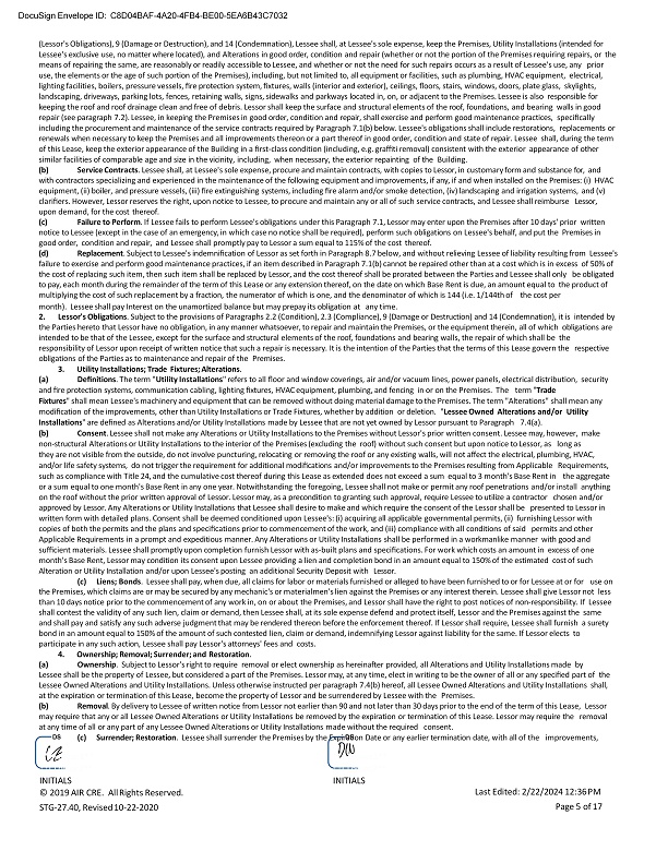 DocuSign Envelope ID: C8D04BAF - 4A20 - 4FB4 - BE00 - 5EA6B43C7032 (Lessor's Obligations), 9 (Damage or Destruction), and 14 (Condemnation), Lessee shall, at Lessee's sole expense, keep the Premises, Utility Installations (intended for Lessee's exclusive use, no matter where located), and Alterations in good order, condition and repair (whether or not the portion of the Premises requiring repairs, or the means of repairing the same, are reasonably or readily accessible to Lessee, and whether or not the need for such repairs occurs as a result of Lessee's use, any prior use, the elements or the age of such portion of the Premises), including, but not limited to, all equipment or facilities, such as plumbing, HVAC equipment, electrical, lighting facilities, boilers, pressure vessels, fire protection system, fixtures, walls (interior and exterior), ceilings, floors, stairs, windows, doors, plate glass, skylights, landscaping, driveways, parking lots, fences, retaining walls, signs, sidewalks and parkways located in, on, or adjacent to the Premises. Lessee is also responsible for keeping the roof and roof drainage clean and free of debris. Lessor shall keep the surface and structural elements of the roof, foundations, and bearing walls in good repair (see paragraph 7.2). Lessee, in keeping the Premises in good order, condition and repair, shall exercise and perform good maintenance practices, specifically including the procurement and maintenance of the service contracts required by Paragraph 7.1(b) below. Lessee's obligations shall include restorations, replacements or renewals when necessary to keep the Premises and all improvements thereon or a part thereof in good order, condition and state of repair. Lessee shall, during the term of this Lease, keep the exterior appearance of the Building in a first - class condition (including, e.g. graffiti removal) consistent with the exterior appearance of other similar facilities of comparable age and size in the vicinity, including, when necessary, the exterior repainting of the Building. (b) Service Contracts . Lessee shall, at Lessee's sole expense, procure and maintain contracts, with copies to Lessor, in customary form and substance for, and with contractors specializing and experienced in the maintenance of the following equipment and improvements, if any, if and when installed on the Premises: (i) HVAC equipment, (ii) boiler, and pressure vessels, (iii) fire extinguishing systems, including fire alarm and/or smoke detection, (iv) landscaping and irrigation systems, and (v) clarifiers. However, Lessor reserves the right, upon notice to Lessee, to procure and maintain any or all of such service contracts, and Lessee shall reimburse Lessor, upon demand, for the cost thereof. (c) Failure to Perform . If Lessee fails to perform Lessee's obligations under this Paragraph 7.1, Lessor may enter upon the Premises after 10 days' prior written notice to Lessee (except in the case of an emergency, in which case no notice shall be required), perform such obligations on Lessee's behalf, and put the Premises in good order, condition and repair, and Lessee shall promptly pay to Lessor a sum equal to 115% of the cost thereof. (d) Replacement . Subject to Lessee's indemnification of Lessor as set forth in Paragraph 8.7 below, and without relieving Lessee of liability resulting from Lessee's failure to exercise and perform good maintenance practices, if an item described in Paragraph 7.1(b) cannot be repaired other than at a cost which is in excess of 50% of the cost of replacing such item, then such item shall be replaced by Lessor, and the cost thereof shall be prorated between the Parties and Lessee shall only be obligated to pay, each month during the remainder of the term of this Lease or any extension thereof, on the date on which Base Rent is due, an amount equal to the product of multiplying the cost of such replacement by a fraction, the numerator of which is one, and the denominator of which is 144 (i.e. 1/144th of the cost per month). Lessee shall pay Interest on the unamortized balance but may prepay its obligation at any time. 2. Lessor's Obligations . Subject to the provisions of Paragraphs 2.2 (Condition), 2.3 (Compliance), 9 (Damage or Destruction) and 14 (Condemnation), it is intended by the Parties hereto that Lessor have no obligation, in any manner whatsoever, to repair and maintain the Premises, or the equipment therein, all of which obligations are intended to be that of the Lessee, except for the surface and structural elements of the roof, foundations and bearing walls, the repair of which shall be the responsibility of Lessor upon receipt of written notice that such a repair is necessary. It is the intention of the Parties that the terms of this Lease govern the respective obligations of the Parties as to maintenance and repair of the Premises. 3. Utility Installations; Trade Fixtures; Alterations . (a) Definitions . The term " Utility Installations " refers to all floor and window coverings, air and/or vacuum lines, power panels, electrical distribution, security and fire protection systems, communication cabling, lighting fixtures, HVAC equipment, plumbing, and fencing in or on the Premises. The term " Trade Fixtures " shall mean Lessee's machinery and equipment that can be removed without doing material damage to the Premises. The term "Alterations" shall mean any modification of the improvements, other than Utility Installations or Trade Fixtures, whether by addition or deletion. " Lessee Owned Alterations and/or Utility Installations " are defined as Alterations and/or Utility Installations made by Lessee that are not yet owned by Lessor pursuant to Paragraph 7.4(a). (b) Consent . Lessee shall not make any Alterations or Utility Installations to the Premises without Lessor's prior written consent. Lessee may, however, make non - structural Alterations or Utility Installations to the interior of the Premises (excluding the roof) wit