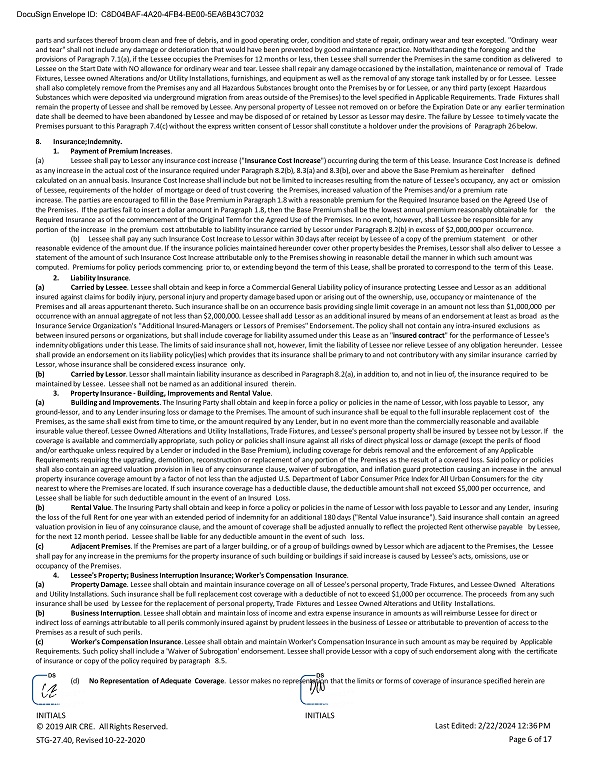 DocuSign Envelope ID: C8D04BAF - 4A20 - 4FB4 - BE00 - 5EA6B43C7032 adequate to cover Lessee's property, business operations or obligations under this Lease. 5. Insurance Policies . Insurance required herein shall be by companies maintaining during the policy term a "General Policyholders Rating" of at least A - , VII, as set forth in the most current issue of "Best's Insurance Guide", or such other rating as may be required by a Lender. Lessee shall not do or permit to be done anything which invalidates the required insurance policies. Lessee shall, prior to the Start Date, deliver to Lessor certified copies of policies of such insurance or certificates with copies of the required endorsements evidencing the existence and amounts of the required insurance. No such policy shall be cancelable or subject to modification except after 30 days prior written notice to Lessor. Lessee shall, at least 10 days prior to the expiration of such policies, furnish Lessor with evidence of renewals or "insurance binders" evidencing renewal thereof, or Lessor may increase his liability insurance coverage and charge the cost thereof to Lessee, which amount shall be payable by Lessee to Lessor upon demand. Such policies shall be for a term of at least one year, or the length of the remaining term of this Lease, whichever is less. If either Party shall fail to procure and maintain the insurance required to be carried by it, the other Party may, but shall not be required to, procure and maintain the same. 6. Waiver of Subrogation . Without affecting any other rights or remedies, Lessee and Lessor each hereby release and relieve the other, and waive their entire right to recover damages against the other, for loss of or damage to its property arising out of or incident to the perils required to be insured against herein. The effect of such releases and waivers is not limited by the amount of insurance carried or required, or by any deductibles applicable hereto. The Parties agree to have their respective property damage insurance carriers waive any right to subrogation that such companies may have against Lessor or Lessee, as the case may be, so long as the insurance is not invalidated thereby. 7. Indemnity . Except for Lessor's gross negligence or willful misconduct, Lessee shall indemnify, protect, defend and hold harmless the Premises, Lessor and its agents, Lessor's master or ground lessor, partners and Lenders, from and against any and all claims, loss of rents and/or damages, liens, judgments, penalties, attorneys' and consultants' fees, expenses and/or liabilities arising out of, involving, or in connection with, a Breach of the Lease by Lessee and/or the use and/or occupancy of the Premises and/or Project by Lessee and/or by Lessee's employees, contractors or invitees. If any action or proceeding is brought against Lessor by reason of any of the foregoing matters, Lessee shall upon notice defend the same at Lessee's expense by counsel reasonably satisfactory to Lessor and Lessor shall cooperate with Lessee in such defense. Lessor need not have first paid any such claim in order to be defended or indemnified. 8. Exemption of Lessor and its Agents from Liability . Notwithstanding the negligence or breach of this Lease by Lessor or its agents, neither Lessor nor its agents shall be liable under any circumstances for: (i) injury or damage to the person or goods, wares, merchandise or other property of Lessee, Lessee's employees, contractors, invitees, customers, or any other person in or about the Premises, whether such damage or injury is caused by or results from fire, steam, electricity, gas, water or rain, indoor air quality, the presence of mold or from the breakage, leakage, obstruction or other defects of pipes, fire sprinklers, wires, appliances, plumbing, HVAC or lighting fixtures, or from any other cause, whether the said injury or damage results from conditions arising upon the Premises or upon other portions of the building of which the Premises are a part, or from other sources or places, (ii) any damages arising from any act or neglect of any other tenant of Lessor or from the failure of Lessor or its agents to enforce the provisions of any other lease in the Project, or (iii) injury to Lessee's business or for any loss of income or profit therefrom. Instead, it is intended that Lessee's sole recourse in the event of such damages or injury be to file a claim on the insurance policy(ies) that Lessee is required to maintain pursuant to the provisions of paragraph 8. 9. Failure to Provide Insurance . Lessee acknowledges that any failure on its part to obtain or maintain the insurance required herein will expose Lessor to risks and potentially cause Lessor to incur costs not contemplated by this Lease, the extent of which will be extremely difficult to ascertain. Accordingly, for any month or portion thereof that Lessee does not maintain the required insurance and/or does not provide Lessor with the required binders or certificates evidencing the existence of the required insurance, the Base Rent shall be automatically increased, without any requirement for notice to Lessee, by an amount equal to 10% of the then existing Base Rent or $100, whichever is greater. The parties agree that such increase in Base Rent represents fair and reasonable compensation for the additional risk/costs that Lessor will incur by reason of Lessee's failure to maintain the required insurance. Such increase in Base Rent shall in no event constitute a waiver of Lessee's Default or Breach with respect to the failure to maintain such insurance, prevent the exercise of any of the other rights and remedies granted hereunder, nor relieve Lessee of its obligation to maintain the insurance specified in this Lease. 9. Damage or Destruction. 1. Definitions . (a) " Premises Partial Damage " shall mean damage or destruction to the improvements on the Premises, other than Lessee Owned Alterations and Utility Installations, which can 