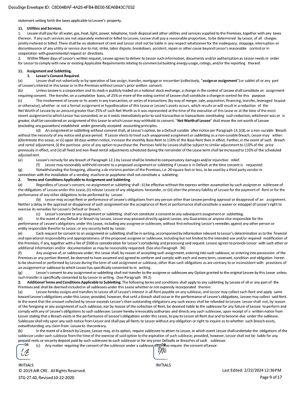 DocuSign Envelope ID: C8D04BAF - 4A20 - 4FB4 - BE00 - 5EA6B43C7032 statement setting forth the taxes applicable to Lessee's property. 11. Utilities and Services. 1. Lessee shall pay for all water, gas, heat, light, power, telephone, trash disposal and other utilities and services supplied to the Premises, together with any taxes thereon. If any such services are not separately metered or billed to Lessee, Lessee shall pay a reasonable proportion, to be determined by Lessor, of all charges jointly metered or billed. There shall be no abatement of rent and Lessor shall not be liable in any respect whatsoever for the inadequacy, stoppage, interruption or discontinuance of any utility or service due to riot, strike, labor dispute, breakdown, accident, repair or other cause beyond Lessor's reasonable control or in cooperation with governmental request or directions. 2. Within fifteen days of Lessor's written request, Lessee agrees to deliver to Lessor such information, documents and/or authorization as Lessor needs in order for Lessor to comply with new or existing Applicable Requirements relating to commercial building energy usage, ratings, and/or the reporting thereof. 11. Assignment and Subletting. 1. Lessor's Consent Required . (a) Lessee shall not voluntarily or by operation of law assign, transfer, mortgage or encumber (collectively, " assign or assignment ") or sublet all or any part of Lessee's interest in this Lease or in the Premises without Lessor's prior written consent. (b) Unless Lessee is a corporation and its stock is publicly traded on a national stock exchange, a change in the control of Lessee shall constitute an assignment requiring consent. The transfer, on a cumulative basis, of 25% or more of the voting control of Lessee shall constitute a change in control for this purpose. (c) The involvement of Lessee or its assets in any transaction, or series of transactions (by way of merger, sale, acquisition, financing, transfer, leveraged buyout or otherwise), whether or not a formal assignment or hypothecation of this Lease or Lessee's assets occurs, which results or will result in a reduction of the Net Worth of Lessee by an amount greater than 25% of such Net Worth as it was represented at the time of the execution of this Lease or at the time of the most recent assignment to which Lessor has consented, or as it exists immediately prior to said transaction or transactions constituting such reduction, whichever was or is greater, shall be considered an assignment of this Lease to which Lessor may withhold its consent. " Net Worth of Lessee " shall mean the net worth of Lessee (excluding any guarantors) established under generally accepted accounting principles. (d) An assignment or subletting without consent shall, at Lessor's option, be a Default curable after notice per Paragraph 13.1(d), or a non - curable Breach without the necessity of any notice and grace period. If Lessor elects to treat such unapproved assignment or subletting as a non - curable Breach, Lessor may either: (i) terminate this Lease, or (ii) upon 30 days written notice, increase the monthly Base Rent to 110% of the Base Rent then in effect. Further, in the event of such Breach and rental adjustment, (i) the purchase price of any option to purchase the Premises held by Lessee shall be subject to similar adjustment to 110% of the price previously in effect, and (ii) all fixed and non - fixed rental adjustments scheduled during the remainder of the Lease term shall be increased to 110% of the scheduled adjusted rent. (e) Lessee's remedy for any breach of Paragraph 12.1 by Lessor shall be limited to compensatory damages and/or injunctive relief. (f) Lessor may reasonably withhold consent to a proposed assignment or subletting if Lessee is in Default at the time consent is requested. (g) Notwithstanding the foregoing, allowing a de minimis portion of the Premises, i.e. 20 square feet or less, to be used by a third party vendor in connection with the installation of a vending machine or payphone shall not constitute a subletting. 2. Terms and Conditions Applicable to Assignment and Subletting . (a) Regardless of Lessor's consent, no assignment or subletting shall : (i) be effective without the express written assumption by such assignee or sublessee of the obligations of Lessee under this Lease, (ii) release Lessee of any obligations hereunder, or (iii) alter the primary liability of Lessee for the payment of Rent or for the performance of any other obligations to be performed by Lessee. (b) Lessor may accept Rent or performance of Lessee's obligations from any person other than Lessee pending approval or disapproval of an assignment. Neither a delay in the approval or disapproval of such assignment nor the acceptance of Rent or performance shall constitute a waiver or estoppel of Lessor's right to exercise its remedies for Lessee's Default or Breach. (c) Lessor's consent to any assignment or subletting shall not constitute a consent to any subsequent assignment or subletting. (d) In the event of any Default or Breach by Lessee, Lessor may proceed directly against Lessee, any Guarantors or anyone else responsible for the performance of Lessee's obligations under this Lease, including any assignee or sublessee, without first exhausting Lessor's remedies against any other person or entity responsible therefor to Lessor, or any security held by Lessor. (e) Each request for consent to an assignment or subletting shall be in writing, accompanied by information relevant to Lessor's determination as to the financial and operational responsibility and appropriateness of the proposed assignee or sublessee, including but not limited to the intended use and/or required modification of the Premises, if any, together with a fee of $500 as consideration for Lessor's considering and processing said request. Lessee agrees to provide Lessor with such other or additional information and/or documentation as may be reasonably re