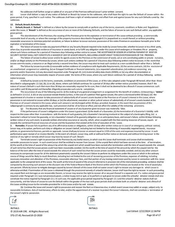 DocuSign Envelope ID: C8D04BAF - 4A20 - 4FB4 - BE00 - 5EA6B43C7032 (d) No sublessee shall further assign or sublet all or any part of the Premises without Lessor's prior written consent. (e) Lessor shall deliver a copy of any notice of Default or Breach by Lessee to the sublessee, who shall have the right to cure the Default of Lessee within the grace period, if any, specified in such notice . The sublessee shall have a right of reimbursement and offset from and against Lessee for any such Defaults cured by the sublessee . 13. Default; Breach; Remedies. 1. Default; Breach . A " Default " is defined as a failure by the Lessee to comply with or perform any of the terms, covenants, conditions or Rules and Regulations under this Lease. A " Breach " is defined as the occurrence of one or more of the following Defaults, and the failure of Lessee to cure such Default within any applicable grace period: (a) The abandonment of the Premises; the vacating of the Premises prior to the expiration or termination of this Lease without providing a commercially reasonable level of security, or where the coverage of the property insurance described in Paragraph 8.3 is jeopardized as a result thereof, or without providing reasonable assurances to minimize potential vandalism; or failure to deliver to Lessor exclusive possession of the entire Premises in accordance herewith prior to the expiration or termination of this Lease. (b) The failure of Lessee to make any payment of Rent or any Security Deposit required to be made by Lessee hereunder, whether to Lessor or to a third party, when due, to provide reasonable evidence of insurance or surety bond, or to fulfill any obligation under this Lease which endangers or threatens life or property, where such failure continues for a period of 3 business days following written notice to Lessee. THE ACCEPTANCE BY LESSOR OF A PARTIAL PAYMENT OF RENT OR SECURITY DEPOSIT SHALL NOT CONSTITUTE A WAIVER OF ANY OF LESSOR'S RIGHTS, INCLUDING LESSOR'S RIGHT TO RECOVER POSSESSION OF THE PREMISES. (c) The failure of Lessee to allow Lessor and/or its agents access to the Premises or the commission of waste, act or acts constituting public or private nuisance, and/or an illegal activity on the Premises by Lessee, where such actions continue for a period of 3 business days following written notice to Lessee. In the event that Lessee commits waste, a nuisance or an illegal activity a second time then, the Lessor may elect to treat such conduct as a non - curable Breach rather than a Default. (d) The failure by Lessee to provide (i) reasonable written evidence of compliance with Applicable Requirements, (ii) the service contracts, (iii) the rescission of an unauthorized assignment or subletting, (iv) an Estoppel Certificate or financial statements, (v) a requested subordination, (vi) evidence concerning any guaranty and/or Guarantor, (vii) any document requested under Paragraph 42, (viii) material safety data sheets (MSDS), or (ix) any other documentation or information which Lessor may reasonably require of Lessee under the terms of this Lease, where any such failure continues for a period of 10 days following written notice to Lessee. (e) A Default by Lessee as to the terms, covenants, conditions or provisions of this Lease, or of the rules adopted under Paragraph 40 hereof, other than those described in subparagraphs 13.1(a), (b), (c) or (d), above, where such Default continues for a period of 30 days after written notice; provided, however, that if the nature of Lessee's Default is such that more than 30 days are reasonably required for its cure, then it shall not be deemed to be a Breach if Lessee commences such cure within said 30 day period and thereafter diligently prosecutes such cure to completion. (f) The occurrence of any of the following events: (i) the making of any general arrangement or assignment for the benefit of creditors; (ii) becoming a " debtor " as defined in 11 U.S.C. Α 101 or any successor statute thereto (unless, in the case of a petition filed against Lessee, the same is dismissed within 60 days); (iii) the appointment of a trustee or receiver to take possession of substantially all of Lessee's assets located at the Premises or of Lessee's interest in this Lease, where possession is not restored to Lessee within 30 days; or (iv) the attachment, execution or other judicial seizure of substantially all of Lessee's assets located at the Premises or of Lessee's interest in this Lease, where such seizure is not discharged within 30 days; provided, however, in the event that any provision of this subparagraph is contrary to any applicable law, such provision shall be of no force or effect, and not affect the validity of the remaining provisions. (g) The discovery that any financial statement of Lessee or of any Guarantor given to Lessor was materially false. (h) If the performance of Lessee's obligations under this Lease is guaranteed: (i) the death of a Guarantor, (ii) the termination of a Guarantor's liability with respect to this Lease other than in accordance with the terms of such guaranty, (iii) a Guarantor's becoming insolvent or the subject of a bankruptcy filing, (iv) a Guarantor's refusal to honor the guaranty, or (v) a Guarantor's breach of its guaranty obligation on an anticipatory basis, and Lessee's failure, within 60 days following written notice of any such event, to provide written alternative assurance or security, which, when coupled with the then existing resources of Lessee, equals or exceeds the combined financial resources of Lessee and the Guarantors that existed at the time of execution of this Lease. 2. Remedies . If Lessee fails to perform any of its affirmative duties or obligations, within 10 days after written notice (or in case of an emergency, without notice), Lessor may, at its option, perform such duty or obligation on Lessee's behalf, including but not limited to the obtaining of reasonably required bonds, insurance policies