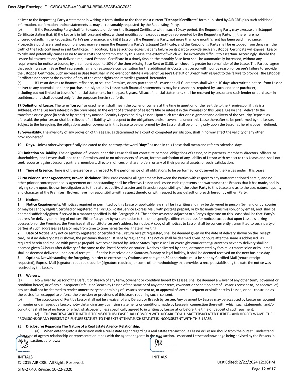 DocuSign Envelope ID: C8D04BAF - 4A20 - 4FB4 - BE00 - 5EA6B43C7032 deliver to the Requesting Party a statement in writing in form similar to the then most current " Estoppel Certificate " form published by AIR CRE, plus such additional information, confirmation and/or statements as may be reasonably requested by the Requesting Party. (b) If the Responding Party shall fail to execute or deliver the Estoppel Certificate within such 10 day period, the Requesting Party may execute an Estoppel Certificate stating that: (i) the Lease is in full force and effect without modification except as may be represented by the Requesting Party, (ii) there are no uncured defaults in the Requesting Party's performance, and (iii) if Lessor is the Requesting Party, not more than one month's rent has been paid in advance. Prospective purchasers and encumbrancers may rely upon the Requesting Party's Estoppel Certificate, and the Responding Party shall be estopped from denying the truth of the facts contained in said Certificate. In addition, Lessee acknowledges that any failure on its part to provide such an Estoppel Certificate will expose Lessor to risks and potentially cause Lessor to incur costs not contemplated by this Lease, the extent of which will be extremely difficult to ascertain. Accordingly, should the Lessee fail to execute and/or deliver a requested Estoppel Certificate in a timely fashion the monthly Base Rent shall be automatically increased, without any requirement for notice to Lessee, by an amount equal to 10% of the then existing Base Rent or $100, whichever is greater for remainder of the Lease. The Parties agree that such increase in Base Rent represents fair and reasonable compensation for the additional risk/costs that Lessor will incur by reason of Lessee's failure to provide the Estoppel Certificate. Such increase in Base Rent shall in no event constitute a waiver of Lessee's Default or Breach with respect to the failure to provide the Estoppel Certificate nor prevent the exercise of any of the other rights and remedies granted hereunder. (c) If Lessor desires to finance, refinance, or sell the Premises, or any part thereof, Lessee and all Guarantors shall within 10 days after written notice from Lessor deliver to any potential lender or purchaser designated by Lessor such financial statements as may be reasonably required by such lender or purchaser, including but not limited to Lessee's financial statements for the past 3 years. All such financial statements shall be received by Lessor and such lender or purchaser in confidence and shall be used only for the purposes herein set forth. 17. Definition of Lessor. The term " Lessor " as used herein shall mean the owner or owners at the time in question of the fee title to the Premises, or, if this is a sublease, of the Lessee's interest in the prior lease. In the event of a transfer of Lessor's title or interest in the Premises or this Lease, Lessor shall deliver to the transferee or assignee (in cash or by credit) any unused Security Deposit held by Lessor. Upon such transfer or assignment and delivery of the Security Deposit, as aforesaid, the prior Lessor shall be relieved of all liability with respect to the obligations and/or covenants under this Lease thereafter to be performed by the Lessor. Subject to the foregoing, the obligations and/or covenants in this Lease to be performed by the Lessor shall be binding only upon the Lessor as hereinabove defined. 18. Severability. The invalidity of any provision of this Lease, as determined by a court of competent jurisdiction, shall in no way affect the validity of any other provision hereof. 19. Days. Unless otherwise specifically indicated to the contrary, the word " days " as used in this Lease shall mean and refer to calendar days. 20. Limitation on Liability. The obligations of Lessor under this Lease shall not constitute personal obligations of Lessor, or its partners, members, directors, officers or shareholders, and Lessee shall look to the Premises, and to no other assets of Lessor, for the satisfaction of any liability of Lessor with respect to this Lease, and shall not seek recourse against Lessor's partners, members, directors, officers or shareholders, or any of their personal assets for such satisfaction. 21. Time of Essence. Time is of the essence with respect to the performance of all obligations to be performed or observed by the Parties under this Lease. 22. No Prior or Other Agreements; Broker Disclaimer . This Lease contains all agreements between the Parties with respect to any matter mentioned herein, and no other prior or contemporaneous agreement or understanding shall be effective. Lessor and Lessee each represents and warrants to the Brokers that it has made, and is relying solely upon, its own investigation as to the nature, quality, character and financial responsibility of the other Party to this Lease and as to the use, nature, quality and character of the Premises. Brokers have no responsibility with respect thereto or with respect to any default or breach hereof by either Party. 23. Notices. 1. Notice Requirements . All notices required or permitted by this Lease or applicable law shall be in writing and may be delivered in person (by hand or by courier) or may be sent by regular, certified or registered mail or U.S. Postal Service Express Mail, with postage prepaid, or by facsimile transmission, or by email, and shall be deemed sufficiently given if served in a manner specified in this Paragraph 23. The addresses noted adjacent to a Party's signature on this Lease shall be that Party's address for delivery or mailing of notices. Either Party may by written notice to the other specify a different address for notice, except that upon Lessee's taking possession of the Premises, the Premises shall constitute Lessee's address for notice. A copy of all notices to Lessor shall be concurrently transmitted to such party or parties at such addresses as Lessor may 