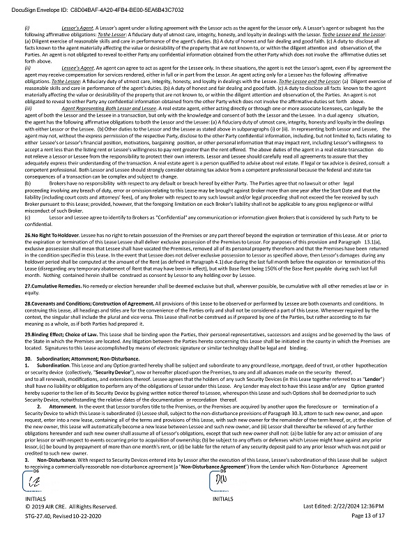 DocuSign Envelope ID: C8D04BAF - 4A20 - 4FB4 - BE00 - 5EA6B43C7032 (i) Lessor's Agent . A Lessor's agent under a listing agreement with the Lessor acts as the agent for the Lessor only. A Lessor's agent or subagent has the following affirmative obligations: To the Lessor : A fiduciary duty of utmost care, integrity, honesty, and loyalty in dealings with the Lessor. To the Lessee and the Lessor : (a) Diligent exercise of reasonable skills and care in performance of the agent's duties. (b) A duty of honest and fair dealing and good faith. (c) A duty to disclose all facts known to the agent materially affecting the value or desirability of the property that are not known to, or within the diligent attention and observation of, the Parties. An agent is not obligated to reveal to either Party any confidential information obtained from the other Party which does not involve the affirmative duties set forth above. (ii) Lessee's Agent . An agent can agree to act as agent for the Lessee only. In these situations, the agent is not the Lessor's agent, even if by agreement the agent may receive compensation for services rendered, either in full or in part from the Lessor. An agent acting only for a Lessee has the following affirmative obligations. To the Lessee : A fiduciary duty of utmost care, integrity, honesty, and loyalty in dealings with the Lessee. To the Lessee and the Lessor : (a) Diligent exercise of reasonable skills and care in performance of the agent's duties. (b) A duty of honest and fair dealing and good faith. (c) A duty to disclose all facts known to the agent materially affecting the value or desirability of the property that are not known to, or within the diligent attention and observation of, the Parties. An agent is not obligated to reveal to either Party any confidential information obtained from the other Party which does not involve the affirmative duties set forth above. (iii) Agent Representing Both Lessor and Lessee . A real estate agent, either acting directly or through one or more associate licensees, can legally be the agent of both the Lessor and the Lessee in a transaction, but only with the knowledge and consent of both the Lessor and the Lessee. In a dual agency situation, the agent has the following affirmative obligations to both the Lessor and the Lessee: (a) A fiduciary duty of utmost care, integrity, honesty and loyalty in the dealings with either Lessor or the Lessee. (b) Other duties to the Lessor and the Lessee as stated above in subparagraphs (i) or (ii). In representing both Lessor and Lessee, the agent may not, without the express permission of the respective Party, disclose to the other Party confidential information, including, but not limited to, facts relating to either Lessee's or Lessor's financial position, motivations, bargaining position, or other personal information that may impact rent, including Lessor's willingness to accept a rent less than the listing rent or Lessee's willingness to pay rent greater than the rent offered. The above duties of the agent in a real estate transaction do not relieve a Lessor or Lessee from the responsibility to protect their own interests. Lessor and Lessee should carefully read all agreements to assure that they adequately express their understanding of the transaction. A real estate agent is a person qualified to advise about real estate. If legal or tax advice is desired, consult a competent professional. Both Lessor and Lessee should strongly consider obtaining tax advice from a competent professional because the federal and state tax consequences of a transaction can be complex and subject to change. (b) Brokers have no responsibility with respect to any default or breach hereof by either Party. The Parties agree that no lawsuit or other legal proceeding involving any breach of duty, error or omission relating to this Lease may be brought against Broker more than one year after the Start Date and that the liability (including court costs and attorneys' fees), of any Broker with respect to any such lawsuit and/or legal proceeding shall not exceed the fee received by such Broker pursuant to this Lease; provided, however, that the foregoing limitation on each Broker's liability shall not be applicable to any gross negligence or willful misconduct of such Broker. (c) Lessor and Lessee agree to identify to Brokers as "Confidential" any communication or information given Brokers that is considered by such Party to be confidential. 26. No Right To Holdover . Lessee has no right to retain possession of the Premises or any part thereof beyond the expiration or termination of this Lease. At or prior to the expiration or termination of this Lease Lessee shall deliver exclusive possession of the Premises to Lessor. For purposes of this provision and Paragraph 13.1(a), exclusive possession shall mean that Lessee shall have vacated the Premises, removed all of its personal property therefrom and that the Premises have been returned in the condition specified in this Lease. In the event that Lessee does not deliver exclusive possession to Lessor as specified above, then Lessor's damages during any holdover period shall be computed at the amount of the Rent (as defined in Paragraph 4.1) due during the last full month before the expiration or termination of this Lease (disregarding any temporary abatement of Rent that may have been in effect), but with Base Rent being 150% of the Base Rent payable during such last full month. Nothing contained herein shall be construed as consent by Lessor to any holding over by Lessee. 27. Cumulative Remedies. No remedy or election hereunder shall be deemed exclusive but shall, wherever possible, be cumulative with all other remedies at law or in equity. 28. Covenants and Conditions; Construction of Agreement. All provisions of this Lease to be observed or performed by Lessee are both covenants and conditions. In construing this Lease, all headings and titles are for the convenience of