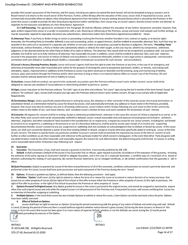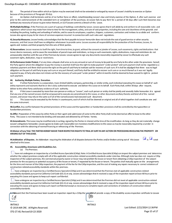 DocuSign Envelope ID: C8D04BAF - 4A20 - 4FB4 - BE00 - 5EA6B43C7032 (b) The period of time within which an Option may be exercised shall not be extended or enlarged by reason of Lessee's inability to exercise an Option because of the provisions of Paragraph 39.4(a). (c) An Option shall terminate and be of no further force or effect, notwithstanding Lessee's due and timely exercise of the Option, if, after such exercise and prior to the commencement of the extended term or completion of the purchase, (i) Lessee fails to pay Rent for a period of 30 days after such Rent becomes due (without any necessity of Lessor to give notice thereof), or (ii) if Lessee commits a Breach of this Lease . 40. Multiple Buildings. If the Premises are a part of a group of buildings controlled by Lessor, Lessee agrees that it will abide by and conform to all reasonable rules and regulations which Lessor may make from time to time for the management, safety, and care of said properties, including the care and cleanliness of the grounds and including the parking, loading and unloading of vehicles, and to cause its employees, suppliers, shippers, customers, contractors and invitees to so abide and conform. Lessee also agrees to pay its fair share of common expenses incurred in connection with such rules and regulations. 41. Security Measures. Lessee hereby acknowledges that the Rent payable to Lessor hereunder does not include the cost of guard service or other security measures, and that Lessor shall have no obligation whatsoever to provide same. Lessee assumes all responsibility for the protection of the Premises, Lessee, its agents and invitees and their property from the acts of third parties. 42. Reservations . Lessor reserves to itself the right, from time to time, to grant, without the consent or joinder of Lessee, such easements, rights and dedications that Lessor deems necessary, and to cause the recordation of parcel maps and restrictions, so long as such easements, rights, dedications, maps and restrictions do not unreasonably interfere with the use of the Premises by Lessee. Lessee agrees to sign any documents reasonably requested by Lessor to effectuate any such easement rights, dedication, map or restrictions. 43. Performance Under Protest. If at any time a dispute shall arise as to any amount or sum of money to be paid by one Party to the other under the provisions hereof, the Party against whom the obligation to pay the money is asserted shall have the right to make payment "under protest" and such payment shall not be regarded as a voluntary payment and there shall survive the right on the part of said Party to institute suit for recovery of such sum. If it shall be adjudged that there was no legal obligation on the part of said Party to pay such sum or any part thereof, said Party shall be entitled to recover such sum or so much thereof as it was not legally required to pay. A Party who does not initiate suit for the recovery of sums paid "under protest" within 6 months shall be deemed to have waived its right to protest such payment. 44. Authority; Multiple Parties; Execution. (a) If either Party hereto is a corporation, trust, limited liability company, partnership, or similar entity, each individual executing this Lease on behalf of such entity represents and warrants that he or she is duly authorized to execute and deliver this Lease on its behalf. Each Party shall, within 30 days after request, deliver to the other Party satisfactory evidence of such authority. (b) If this Lease is executed by more than one person or entity as "Lessee", each such person or entity shall be jointly and severally liable hereunder. It is agreed that any one of the named Lessees shall be empowered to execute any amendment to this Lease, or other document ancillary thereto and bind all of the named Lessees, and Lessor may rely on the same as if all of the named Lessees had executed such document. (c) This Lease may be executed by the Parties in counterparts, each of which shall be deemed an original and all of which together shall constitute one and the same instrument. 40. Conflict. Any conflict between the printed provisions of this Lease and the typewritten or handwritten provisions shall be controlled by the typewritten or handwritten provisions. 41. Offer . Preparation of this Lease by either Party or their agent and submission of same to the other Party shall not be deemed an offer to lease to the other Party. This Lease is not intended to be binding until executed and delivered by all Parties hereto. 42. Amendments. This Lease may be modified only in writing, signed by the Parties in interest at the time of the modification. As long as they do not materially change Lessee's obligations hereunder, Lessee agrees to make such reasonable non - monetary modifications to this Lease as may be reasonably required by a Lender in connection with the obtaining of normal financing or refinancing of the Premises. 43. Waiver of Jury Trial. THE PARTIES HEREBY WAIVE THEIR RESPECTIVE RIGHTS TO TRIAL BY JURY IN ANY ACTION OR PROCEEDING INVOLVING THE PROPERTY OR ARISING OUT OF THIS LEASE. 44. Arbitration of Disputes. An Addendum requiring the Arbitration of all disputes between the Parties and/or Brokers arising out of this Lease is is not attached to this Lease. 45. Accessibility; Americans with Disabilities Act. (a) The Premises: have not undergone an inspection by a Certified Access Specialist (CASp). Note: A Certified Access Specialist (CASp) can inspect the subject premises and determine whether the subject premises comply with all of the applicable construction - related accessibility standards under state law. Although state law does not require a CASp inspection of the subject premises, the commercial property owner or lessor may not prohibit the lessee or tenant from obtaining a CASp inspection of the subject premises for the occupancy or potential occupancy of the lessee or tenant, if requested by the lessee or tenan