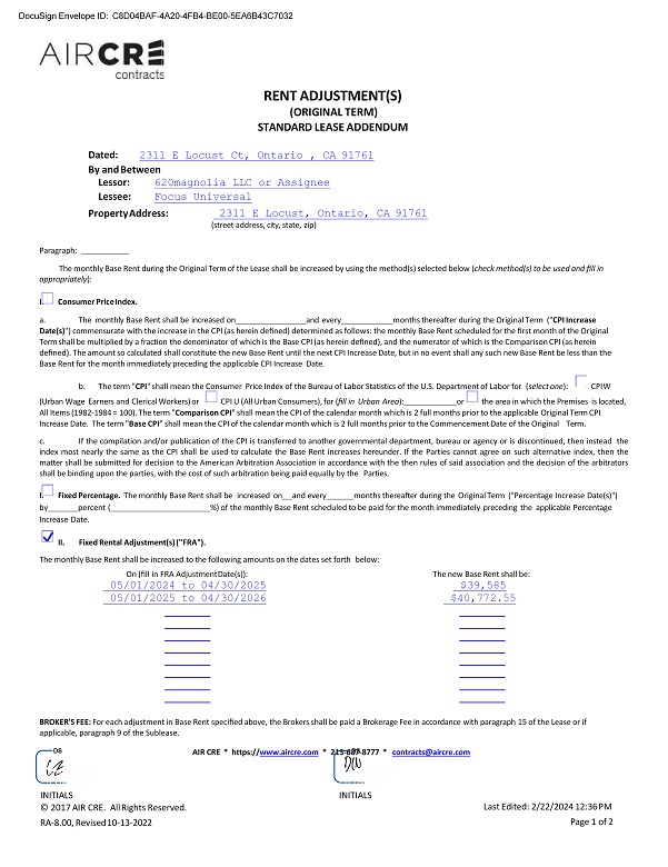 RENT ADJUSTMENT(S) (ORIGINAL TERM) STANDARD LEASE ADDENDUM Dated: 2311 E Locust Ct, Ontario , CA 91761 By and Between Lessor: 620magnolia LLC or Assignee Lessee: Focus Universal Property Address: 2311 E Locust, Ontario, CA 91761 (street address, city, state, zip) Paragraph: The monthly Base Rent during the Original Term of the Lease shall be increased by using the method(s) selected below ( check method(s) to be used and fill in appropriately ): I. Consumer Price Index. a. The monthly Base Rent shall be increased on and every months thereafter during the Original Term (" CPI Increase Date(s) ") commensurate with the increase in the CPI (as herein defined) determined as follows: the monthly Base Rent scheduled for the first month of the Original Term shall be multiplied by a fraction the denominator of which is the Base CPI (as herein defined), and the numerator of which is the Comparison CPI (as herein defined). The amount so calculated shall constitute the new Base Rent until the next CPI Increase Date, but in no event shall any such new Base Rent be less than the Base Rent for the month immediately preceding the applicable CPI Increase Date. b. The term " CPI " shall mean the Consumer Price Index of the Bureau of Labor Statistics of the U.S. Department of Labor for ( select one ): CPI W (Urban Wage Earners and Clerical Workers) or CPI U (All Urban Consumers), for ( fill in Urban Area ): or the area in which the Premises is located, All Items (1982 - 1984 = 100). The term " Comparison CPI " shall mean the CPI of the calendar month which is 2 full months prior to the applicable Original Term CPI Increase Date. The term " Base CPI " shall mean the CPI of the calendar month which is 2 full months prior to the Commencement Date of the Original Term. c. If the compilation and/or publication of the CPI is transferred to another governmental department, bureau or agency or is discontinued, then instead the index most nearly the same as the CPI shall be used to calculate the Base Rent increases hereunder . If the Parties cannot agree on such alternative index, then the matter shall be submitted for decision to the American Arbitration Association in accordance with the then rules of said association and the decision of the arbitrators shall be binding upon the parties, with the cost of such arbitration being paid equally by the Parties . I. Fixed Percentage. The monthly Base Rent shall be increased on and every months thereafter during the Original Term ("Percentage Increase Date(s)") by percent ( %) of the monthly Base Rent scheduled to be paid for the month immediately preceding the applicable Percentage Increase Date. II. Fixed Rental Adjustment(s) ("FRA"). The monthly Base Rent shall be increased to the following amounts on the dates set forth below: On (fill in FRA Adjustment Date(s)): 05/01/2024 to 04/30/2025 05/01/2025 to 04/30/2026 The new Base Rent shall be: $39,585 $40,772.55 BROKER'S FEE: For each adjustment in Base Rent specified above, the Brokers shall be paid a Brokerage Fee in accordance with paragraph 15 of the Lease or if applicable, paragraph 9 of the Sublease. AIR CRE * https:// www.aircre.com * 213 - 687 - 8777 * contracts@aircre.com DocuSign Envelope ID: C8D04BAF - 4A20 - 4FB4 - BE00 - 5EA6B43C7032 **I - Lessor1** * * I - L e ss o r 2 * * INITIALS © 2017 AIR CRE. All Rights Reserved. RA - 8.00, Revised 10 - 13 - 2022 **I - Lessee1** * * I - Le s se e 2 ** INITIALS Last Edited: 2/22/2024 12:36 PM Page 1 of 2