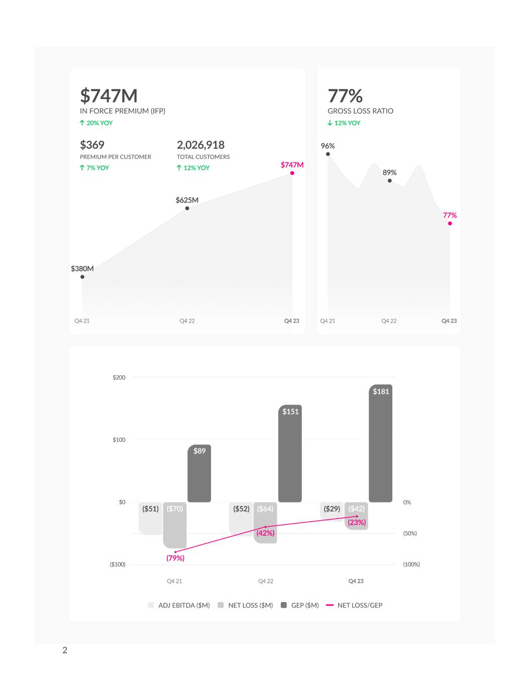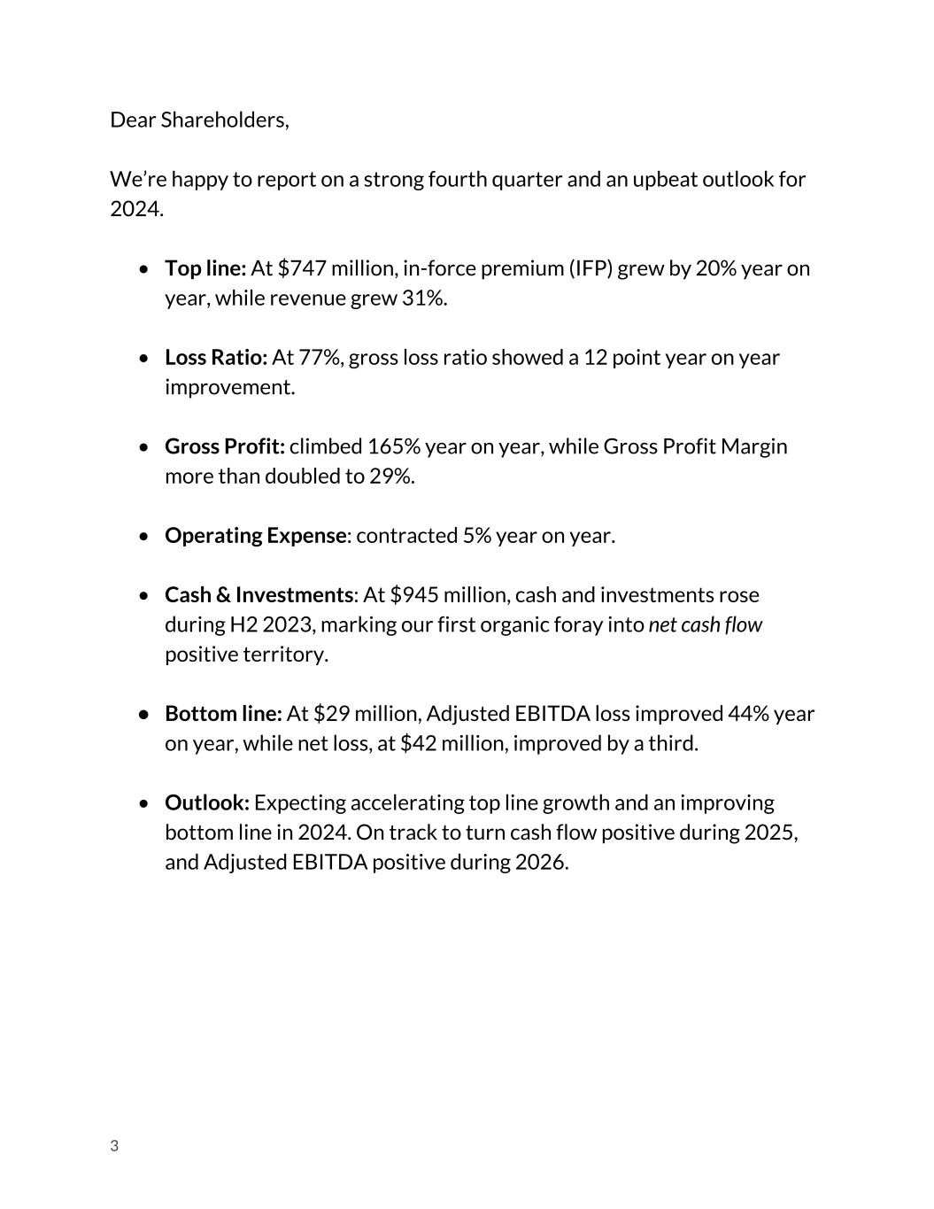 Dear Shareholders, We’re happy to report on a strong fourth quarter and an upbeat outlook for 2024. • Top line: At $747 million, in-force premium (IFP) grew by 20% year on year, while revenue grew 31%. • Loss Ratio: At 77%, gross loss ratio showed a 12 point year on year improvement. • Gross Profit: climbed 165% year on year, while Gross Profit Margin more than doubled to 29%. • Operating Expense: contracted 5% year on year. • Cash & Investments: At $945 million, cash and investments rose during H2 2023, marking our first organic foray into net cash flow positive territory. • Bottom line: At $29 million, Adjusted EBITDA loss improved 44% year on year, while net loss, at $42 million, improved by a third. • Outlook: Expecting accelerating top line growth and an improving bottom line in 2024. On track to turn cash flow positive during 2025, and Adjusted EBITDA positive during 2026. 3