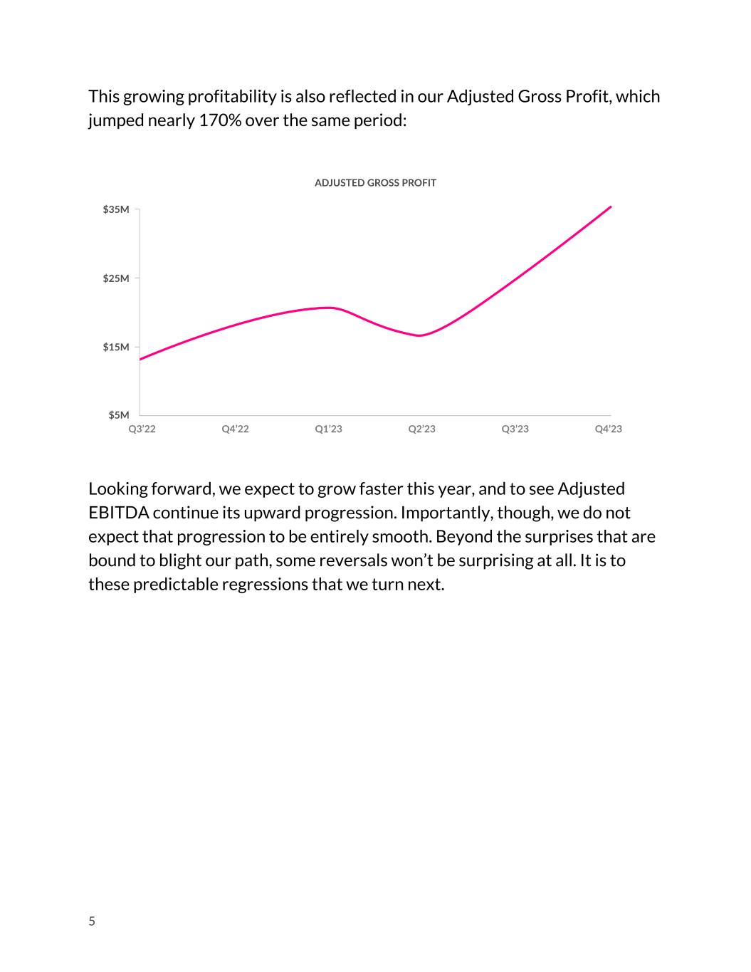 This growing profitability is also reflected in our Adjusted Gross Profit, which jumped nearly 170% over the same period: Looking forward, we expect to grow faster this year, and to see Adjusted EBITDA continue its upward progression. Importantly, though, we do not expect that progression to be entirely smooth. Beyond the surprises that are bound to blight our path, some reversals won’t be surprising at all. It is to these predictable regressions that we turn next. 5