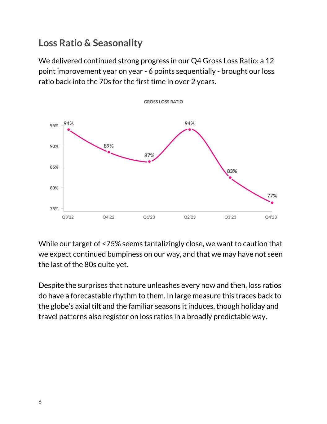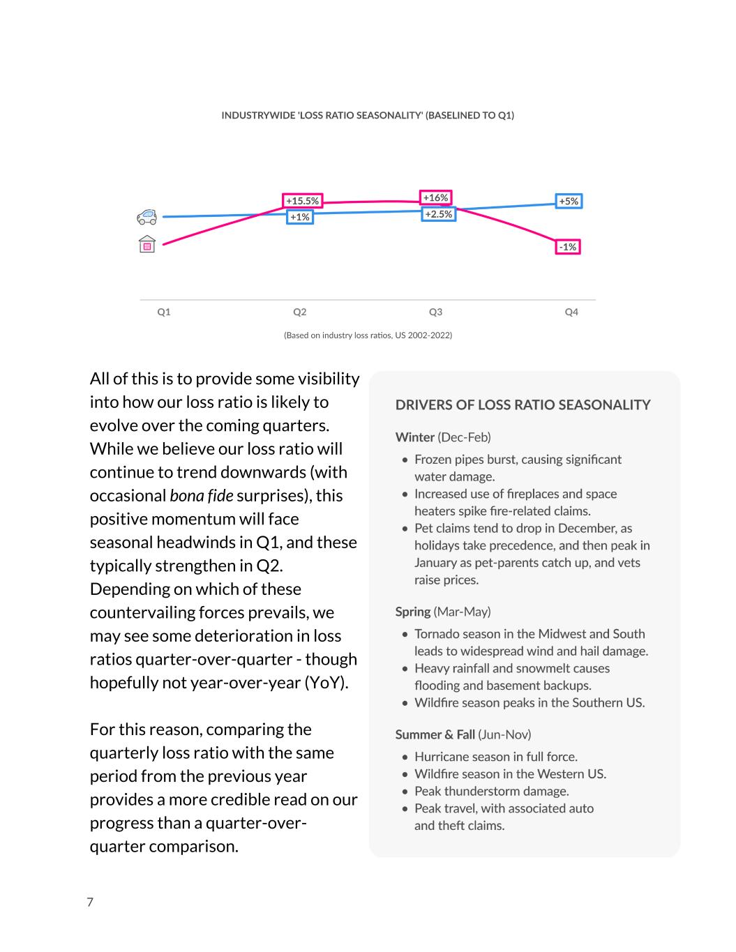All of this is to provide some visibility into how our loss ratio is likely to evolve over the coming quarters. While we believe our loss ratio will continue to trend downwards (with occasional bona fide surprises), this positive momentum will face seasonal headwinds in Q1, and these typically strengthen in Q2. Depending on which of these countervailing forces prevails, we may see some deterioration in loss ratios quarter-over-quarter - though hopefully not year-over-year (YoY). For this reason, comparing the quarterly loss ratio with the same period from the previous year provides a more credible read on our progress than a quarter-over- quarter comparison. 7