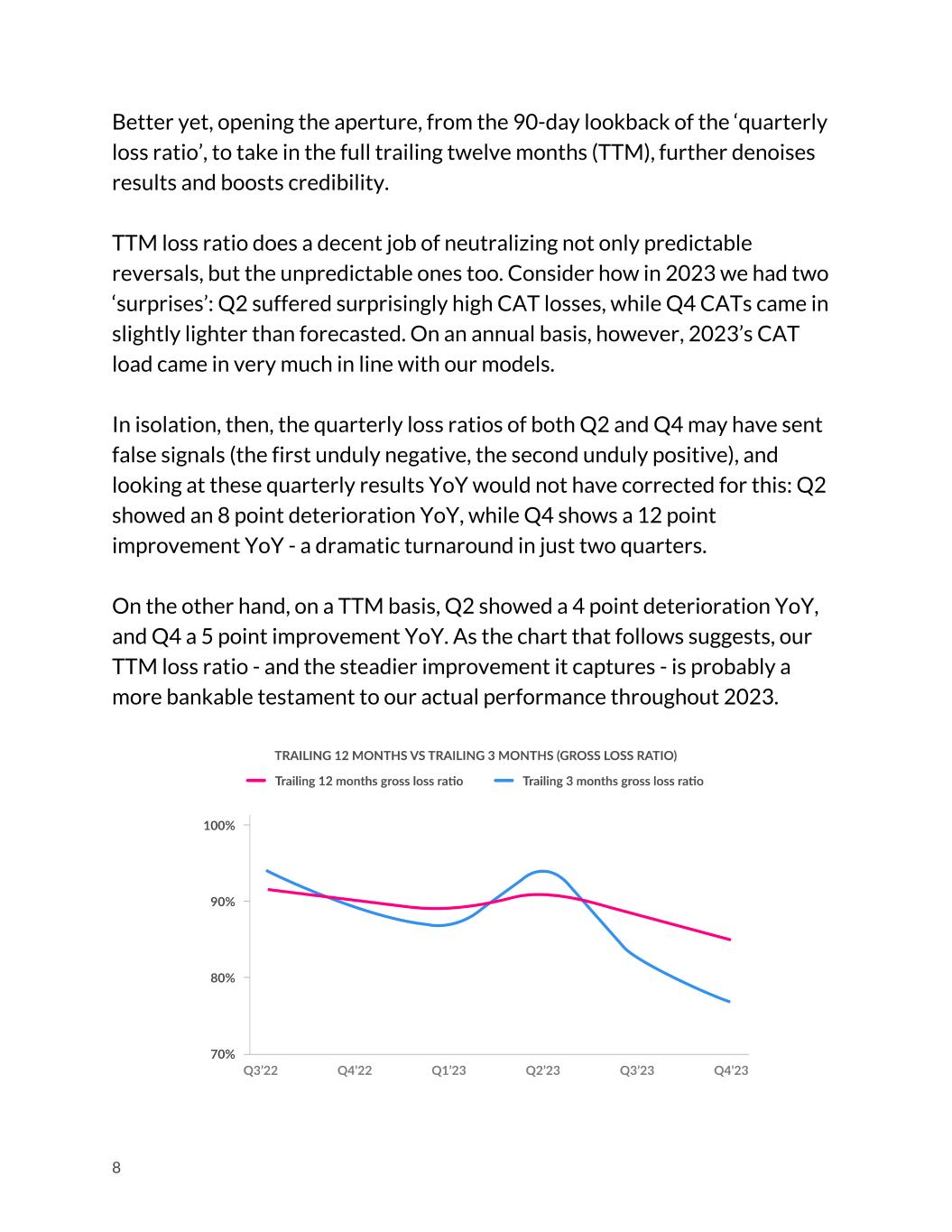Better yet, opening the aperture, from the 90-day lookback of the ‘quarterly loss ratio’, to take in the full trailing twelve months (TTM), further denoises results and boosts credibility. TTM loss ratio does a decent job of neutralizing not only predictable reversals, but the unpredictable ones too. Consider how in 2023 we had two ‘surprises’: Q2 suffered surprisingly high CAT losses, while Q4 CATs came in slightly lighter than forecasted. On an annual basis, however, 2023’s CAT load came in very much in line with our models. In isolation, then, the quarterly loss ratios of both Q2 and Q4 may have sent false signals (the first unduly negative, the second unduly positive), and looking at these quarterly results YoY would not have corrected for this: Q2 showed an 8 point deterioration YoY, while Q4 shows a 12 point improvement YoY - a dramatic turnaround in just two quarters. On the other hand, on a TTM basis, Q2 showed a 4 point deterioration YoY, and Q4 a 5 point improvement YoY. As the chart that follows suggests, our TTM loss ratio - and the steadier improvement it captures - is probably a more bankable testament to our actual performance throughout 2023. 8
