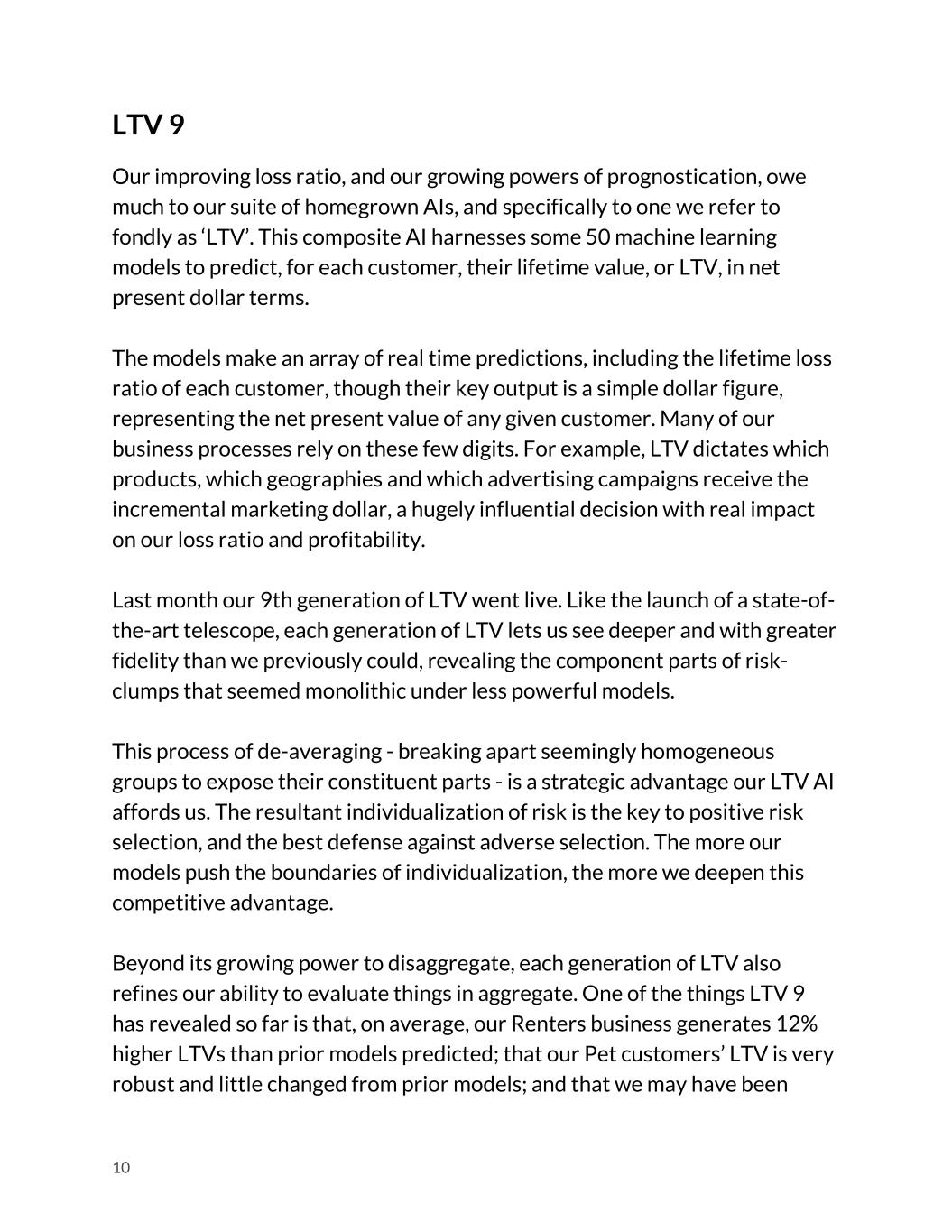 LTV 9 Our improving loss ratio, and our growing powers of prognostication, owe much to our suite of homegrown AIs, and specifically to one we refer to fondly as ‘LTV’. This composite AI harnesses some 50 machine learning models to predict, for each customer, their lifetime value, or LTV, in net present dollar terms. The models make an array of real time predictions, including the lifetime loss ratio of each customer, though their key output is a simple dollar figure, representing the net present value of any given customer. Many of our business processes rely on these few digits. For example, LTV dictates which products, which geographies and which advertising campaigns receive the incremental marketing dollar, a hugely influential decision with real impact on our loss ratio and profitability. Last month our 9th generation of LTV went live. Like the launch of a state-of- the-art telescope, each generation of LTV lets us see deeper and with greater fidelity than we previously could, revealing the component parts of risk- clumps that seemed monolithic under less powerful models. This process of de-averaging - breaking apart seemingly homogeneous groups to expose their constituent parts - is a strategic advantage our LTV AI affords us. The resultant individualization of risk is the key to positive risk selection, and the best defense against adverse selection. The more our models push the boundaries of individualization, the more we deepen this competitive advantage. Beyond its growing power to disaggregate, each generation of LTV also refines our ability to evaluate things in aggregate. One of the things LTV 9 has revealed so far is that, on average, our Renters business generates 12% higher LTVs than prior models predicted; that our Pet customers’ LTV is very robust and little changed from prior models; and that we may have been 10