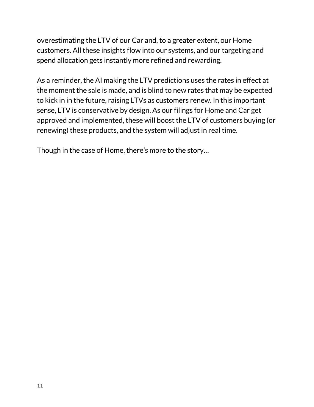 overestimating the LTV of our Car and, to a greater extent, our Home customers. All these insights flow into our systems, and our targeting and spend allocation gets instantly more refined and rewarding. As a reminder, the AI making the LTV predictions uses the rates in effect at the moment the sale is made, and is blind to new rates that may be expected to kick in in the future, raising LTVs as customers renew. In this important sense, LTV is conservative by design. As our filings for Home and Car get approved and implemented, these will boost the LTV of customers buying (or renewing) these products, and the system will adjust in real time. Though in the case of Home, there’s more to the story… 11