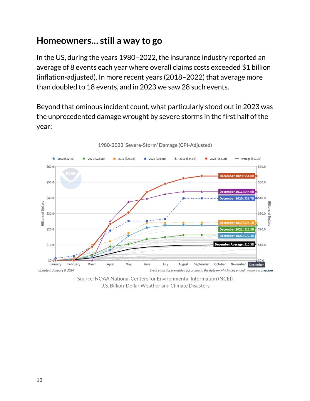 Homeowners… still a way to go In the US, during the years 1980–2022, the insurance industry reported an average of 8 events each year where overall claims costs exceeded $1 billion (inflation-adjusted). In more recent years (2018–2022) that average more than doubled to 18 events, and in 2023 we saw 28 such events. Beyond that ominous incident count, what particularly stood out in 2023 was the unprecedented damage wrought by severe storms in the first half of the year: 1980-2023 ‘Severe-Storm’ Damage (CPI-Adjusted) Source: NOAA National Centers for Environmental Information (NCEI) U.S. Billion-Dollar Weather and Climate Disasters 12