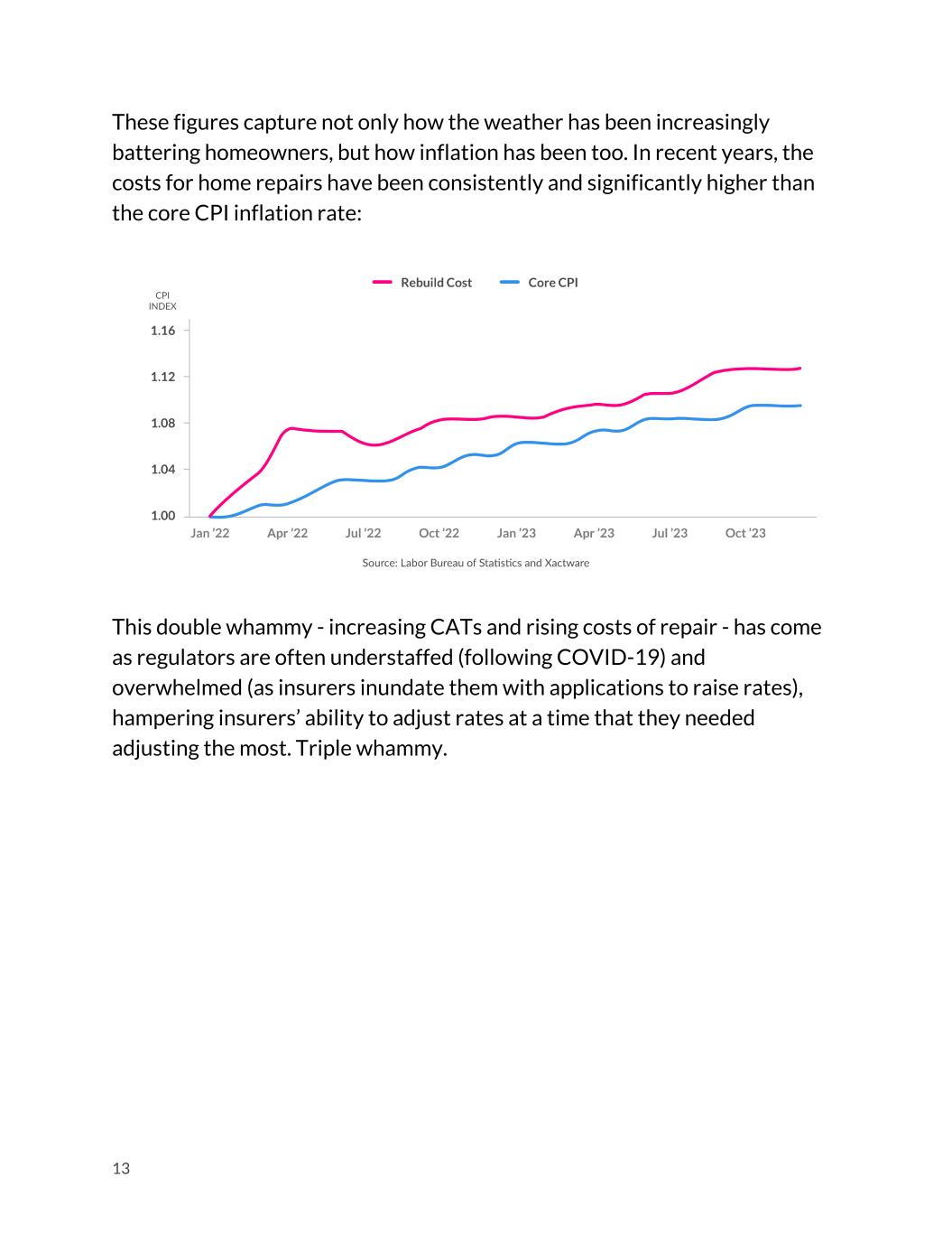 These figures capture not only how the weather has been increasingly battering homeowners, but how inflation has been too. In recent years, the costs for home repairs have been consistently and significantly higher than the core CPI inflation rate: This double whammy - increasing CATs and rising costs of repair - has come as regulators are often understaffed (following COVID-19) and overwhelmed (as insurers inundate them with applications to raise rates), hampering insurers’ ability to adjust rates at a time that they needed adjusting the most. Triple whammy. 13