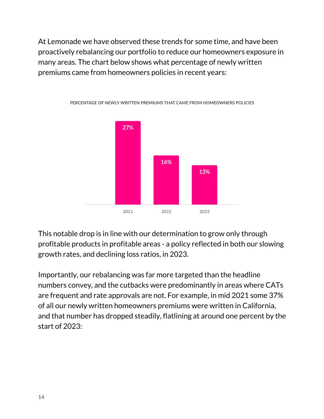 At Lemonade we have observed these trends for some time, and have been proactively rebalancing our portfolio to reduce our homeowners exposure in many areas. The chart below shows what percentage of newly written premiums came from homeowners policies in recent years: This notable drop is in line with our determination to grow only through profitable products in profitable areas - a policy reflected in both our slowing growth rates, and declining loss ratios, in 2023. Importantly, our rebalancing was far more targeted than the headline numbers convey, and the cutbacks were predominantly in areas where CATs are frequent and rate approvals are not. For example, in mid 2021 some 37% of all our newly written homeowners premiums were written in California, and that number has dropped steadily, flatlining at around one percent by the start of 2023: 14