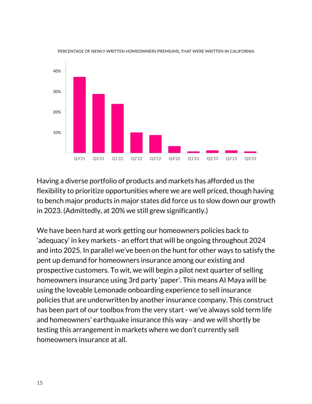 Having a diverse portfolio of products and markets has afforded us the flexibility to prioritize opportunities where we are well priced, though having to bench major products in major states did force us to slow down our growth in 2023. (Admittedly, at 20% we still grew significantly.) We have been hard at work getting our homeowners policies back to ‘adequacy’ in key markets - an effort that will be ongoing throughout 2024 and into 2025. In parallel we’ve been on the hunt for other ways to satisfy the pent up demand for homeowners insurance among our existing and prospective customers. To wit, we will begin a pilot next quarter of selling homeowners insurance using 3rd party ‘paper’. This means AI Maya will be using the loveable Lemonade onboarding experience to sell insurance policies that are underwritten by another insurance company. This construct has been part of our toolbox from the very start - we’ve always sold term life and homeowners’ earthquake insurance this way - and we will shortly be testing this arrangement in markets where we don’t currently sell homeowners insurance at all. 15