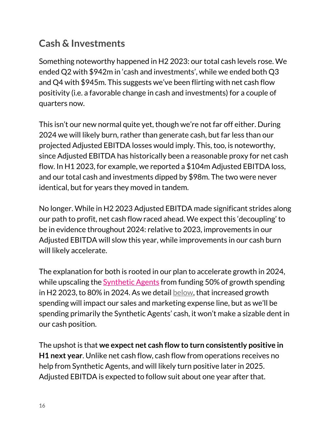 Cash & Investments Something noteworthy happened in H2 2023: our total cash levels rose. We ended Q2 with $942m in ‘cash and investments’, while we ended both Q3 and Q4 with $945m. This suggests we’ve been flirting with net cash flow positivity (i.e. a favorable change in cash and investments) for a couple of quarters now. This isn’t our new normal quite yet, though we’re not far off either. During 2024 we will likely burn, rather than generate cash, but far less than our projected Adjusted EBITDA losses would imply. This, too, is noteworthy, since Adjusted EBITDA has historically been a reasonable proxy for net cash flow. In H1 2023, for example, we reported a $104m Adjusted EBITDA loss, and our total cash and investments dipped by $98m. The two were never identical, but for years they moved in tandem. No longer. While in H2 2023 Adjusted EBITDA made significant strides along our path to profit, net cash flow raced ahead. We expect this ‘decoupling’ to be in evidence throughout 2024: relative to 2023, improvements in our Adjusted EBITDA will slow this year, while improvements in our cash burn will likely accelerate. The explanation for both is rooted in our plan to accelerate growth in 2024, while upscaling the Synthetic Agents from funding 50% of growth spending in H2 2023, to 80% in 2024. As we detail below, that increased growth spending will impact our sales and marketing expense line, but as we’ll be spending primarily the Synthetic Agents’ cash, it won’t make a sizable dent in our cash position. The upshot is that we expect net cash flow to turn consistently positive in H1 next year. Unlike net cash flow, cash flow from operations receives no help from Synthetic Agents, and will likely turn positive later in 2025. Adjusted EBITDA is expected to follow suit about one year after that. 16