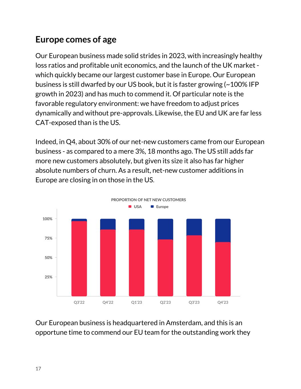 Europe comes of age Our European business made solid strides in 2023, with increasingly healthy loss ratios and profitable unit economics, and the launch of the UK market - which quickly became our largest customer base in Europe. Our European business is still dwarfed by our US book, but it is faster growing (~100% IFP growth in 2023) and has much to commend it. Of particular note is the favorable regulatory environment: we have freedom to adjust prices dynamically and without pre-approvals. Likewise, the EU and UK are far less CAT-exposed than is the US. Indeed, in Q4, about 30% of our net-new customers came from our European business - as compared to a mere 3%, 18 months ago. The US still adds far more new customers absolutely, but given its size it also has far higher absolute numbers of churn. As a result, net-new customer additions in Europe are closing in on those in the US. Our European business is headquartered in Amsterdam, and this is an opportune time to commend our EU team for the outstanding work they 17