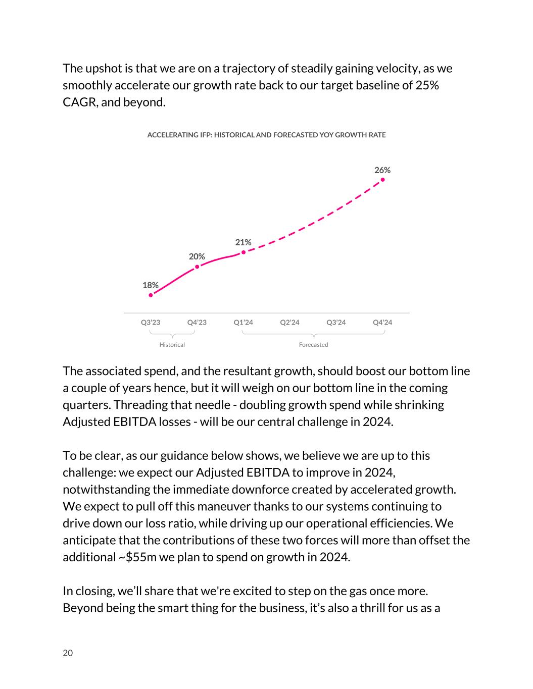 Forecast for 2024: Acceleration! 2023 was a year of extraordinary challenges in the insurance world: the hardest reinsurance market in decades, some of the worst winter storms on record, and combined ratios above 100 throughout the industry. Several of the largest insurers in the US pulled out of some of its largest states - an unprecedented sign of distress. And yet, 2023 was a landmark year for Lemonade. Two years ago we said that losses would peak in Q3 2022, and so they did. 2023 was the first year where our Adjusted EBITDA improved steadily, even as the business grew significantly. Indeed, in 2023 our hypothesis was backed up by our results: an improving loss ratio, a top line far outpacing the expense line, and a path to profit easily traceable through our financials. Industrywide challenges notwithstanding, we will remember 2023 as a pivotal year for Lemonade. Turning to 2024, there’s reason to be hopeful that many of the industry’s headwinds of ‘22-‘23 may turn into tailwinds in ‘24-‘25: inflation seems to be receding, new rate approvals are adding up and earning in, and if the costs of capital come down, we may yet see a moderation in reinsurance costs too. Even if all these wishes come true, however, within the four walls of Lemonade we will have our work cut out for us. As the universe of products and geographies where we are rate-adequate expands, we intend to grow in lockstep. Ours, after all, is a business that grows in profitability as it grows in scale - and so grow we must. That's why we plan to roughly double our growth budget in 2024, from the $55m spent in 2023. Doubling spend won't double our growth rate, since (i) the number of customers we acquire organically won't be impacted much, and (ii) our denominator has swelled - but in dollar terms we expect to add about 50% more IFP in 2024 than we did in 2023. 19