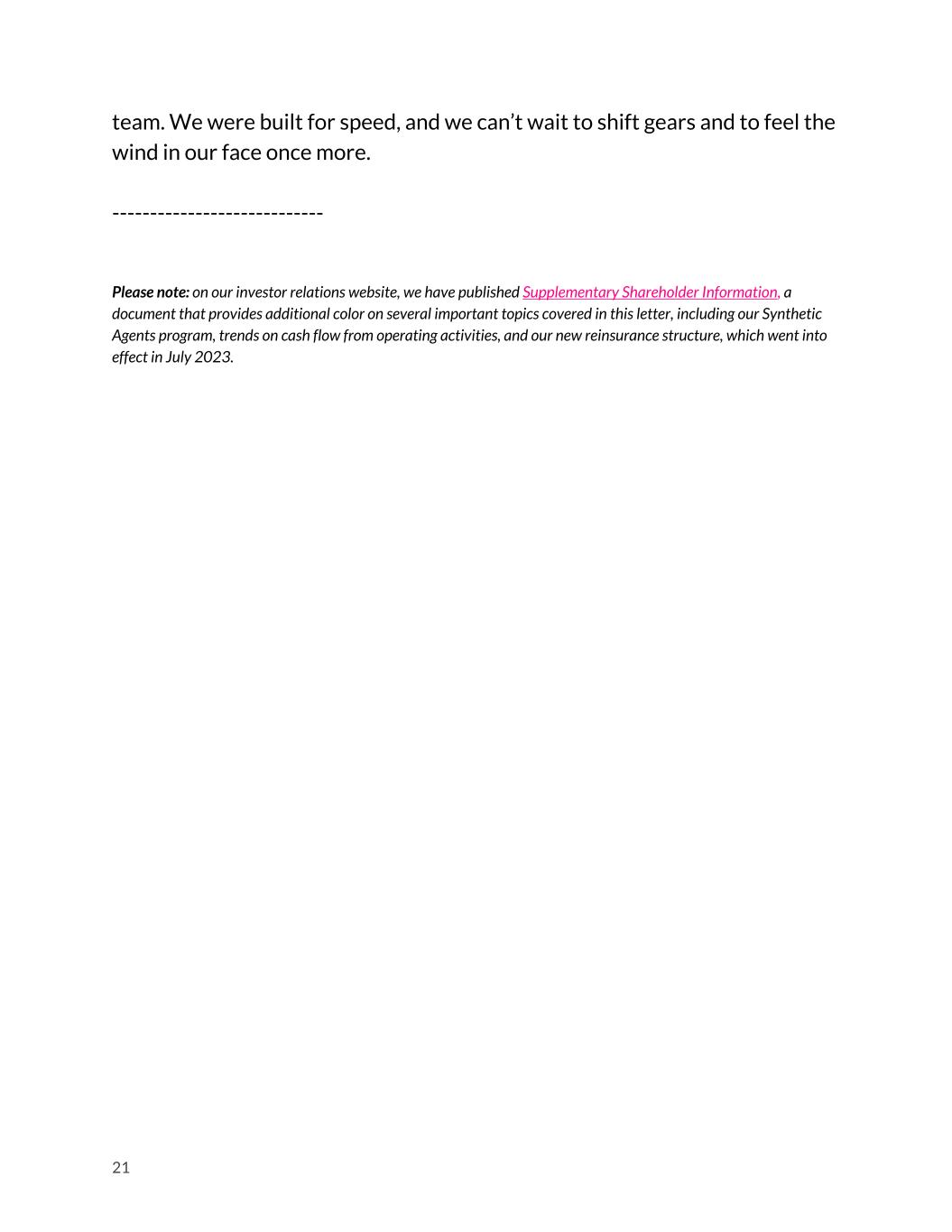 team. We were built for speed, and we can’t wait to shift gears and to feel the wind in our face once more. ---------------------------- Please note: on our investor relations website, we have published Supplementary Shareholder Information, a document that provides additional color on several important topics covered in this letter, including our Synthetic Agents program, trends on cash flow from operating activities, and our new reinsurance structure, which went into effect in July 2023. 21