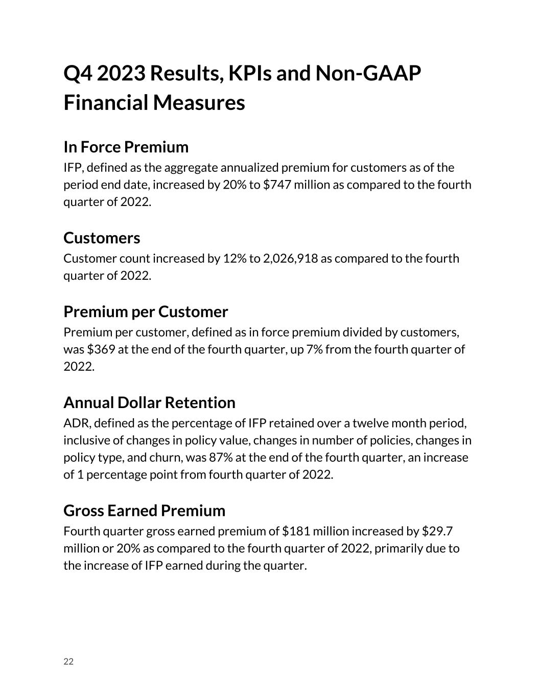 Q4 2023 Results, KPIs and Non-GAAP Financial Measures In Force Premium IFP, defined as the aggregate annualized premium for customers as of the period end date, increased by 20% to $747 million as compared to the fourth quarter of 2022. Customers Customer count increased by 12% to 2,026,918 as compared to the fourth quarter of 2022. Premium per Customer Premium per customer, defined as in force premium divided by customers, was $369 at the end of the fourth quarter, up 7% from the fourth quarter of 2022. Annual Dollar Retention ADR, defined as the percentage of IFP retained over a twelve month period, inclusive of changes in policy value, changes in number of policies, changes in policy type, and churn, was 87% at the end of the fourth quarter, an increase of 1 percentage point from fourth quarter of 2022. Gross Earned Premium Fourth quarter gross earned premium of $181 million increased by $29.7 million or 20% as compared to the fourth quarter of 2022, primarily due to the increase of IFP earned during the quarter. 22