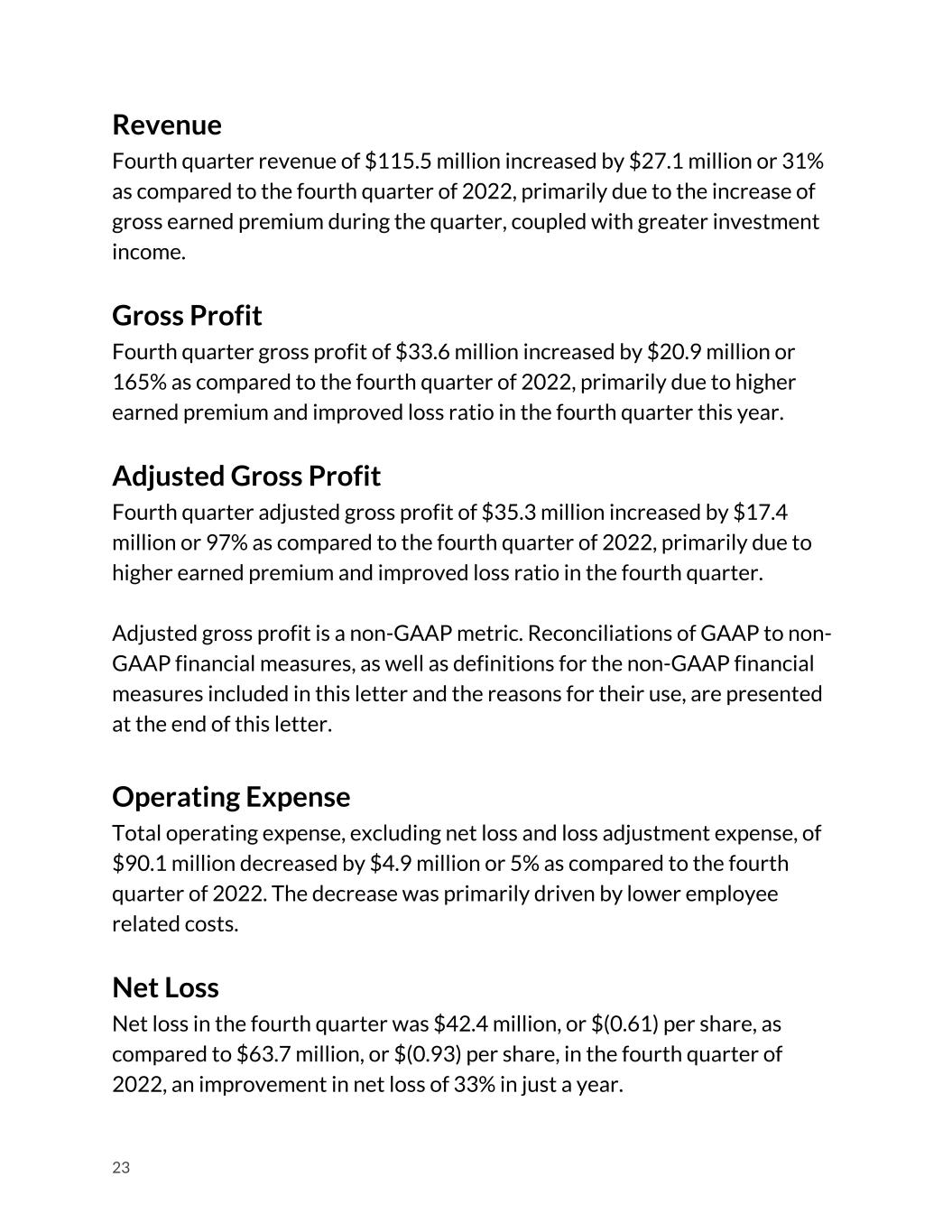 Revenue Fourth quarter revenue of $115.5 million increased by $27.1 million or 31% as compared to the fourth quarter of 2022, primarily due to the increase of gross earned premium during the quarter, coupled with greater investment income. Gross Profit Fourth quarter gross profit of $33.6 million increased by $20.9 million or 165% as compared to the fourth quarter of 2022, primarily due to higher earned premium and improved loss ratio in the fourth quarter this year. Adjusted Gross Profit Fourth quarter adjusted gross profit of $35.3 million increased by $17.4 million or 97% as compared to the fourth quarter of 2022, primarily due to higher earned premium and improved loss ratio in the fourth quarter. Adjusted gross profit is a non-GAAP metric. Reconciliations of GAAP to non- GAAP financial measures, as well as definitions for the non-GAAP financial measures included in this letter and the reasons for their use, are presented at the end of this letter. Operating Expense Total operating expense, excluding net loss and loss adjustment expense, of $90.1 million decreased by $4.9 million or 5% as compared to the fourth quarter of 2022. The decrease was primarily driven by lower employee related costs. Net Loss Net loss in the fourth quarter was $42.4 million, or $(0.61) per share, as compared to $63.7 million, or $(0.93) per share, in the fourth quarter of 2022, an improvement in net loss of 33% in just a year. 23